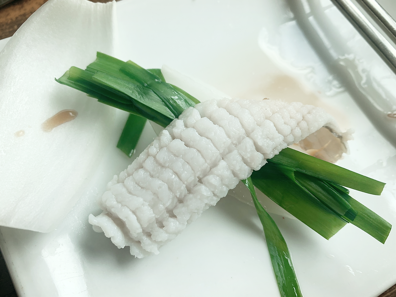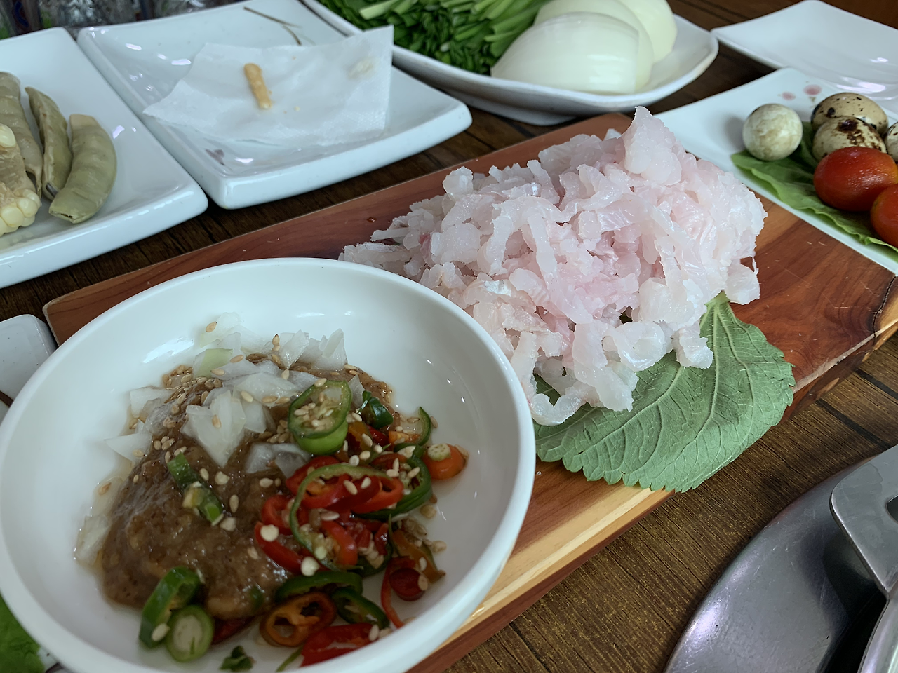 2명이서 갯장어 사시미와 샤브샤브 세트를 시켰다(소, 120,000원). 장어회는 처음 먹어보는 것 같다. 샤브샤브가 나오기 전, 갯장어 사시미가 나왔다. 처음 먹어보는 맛이었는데, 맛이 좋았다. 처음엔 쫄깃한 듯하면서도 지방 때문인지 씹다 보면 금새 부드럽게 장어 살이 녹아내렸다. 은은한 고소함이 느껴졌다. 정말 순식간에 회가 사라졌다ㅎㅎ 회를 먹고 나니 갯장어 샤브샤브가 나왔다. 갯장어 샤브샤브는 갯장어 뼈와 야채를 넣고 끓인 육수에 장어를 살짝 데쳐먹는 샤브샤브다. 살짝 데친 갯장에 살에 부추나 양파를 올리고 간장소스를 얹으면 정말 맛있다. 장어 샤브샤브는 10초에서 15초 사이로 정말 살짝 익혀야 한다. 너무 오래 익히면 살점이 부스러진다고 한다. 직원 분의 말을 못 믿고 푹 익힌 친구는 부스러진 장어를 직접 경험했다.ㅎㅎ 붕장어와 갯장어 샤브샤브를 둘 다 먹어봤는데, 솔직히 말하면 샤브샤브는 큰 차이를 모르겠다. 붕장어가 좀 더 부드러웠던 것 같기도 한데, 블라인드 테스트를 하면 가려낼 수 있는 정도의 차인가 싶다. 반찬 중에 정말 맛있었던 건 갯장어 뼈 튀김이다. 갯장어 뼈는 딱딱한데, 여름철에 뼈가 부드러워진다고 한다. 철이 지나면 잔뼈가 딱딱해져 이렇게 튀김으로는 먹을 수가 없다고 한다. 처음엔 이게 뭐지 했는데, 한 입 맛 본 후로 멈출 수가 없었다. 바삭한데, 고소하면서도 장어 향이 느껴져 정말 맛있었다.