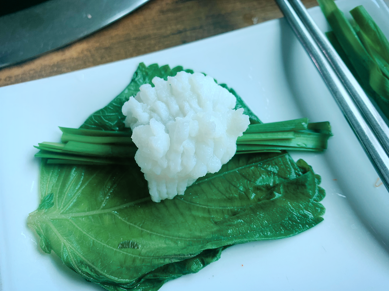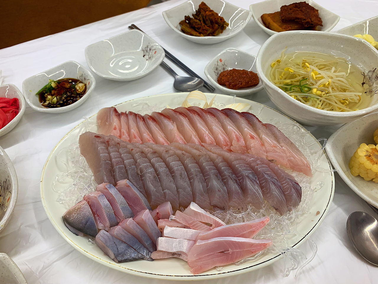 조일식당의 메뉴는 고민할 게 없다. 선어회와 튀김뿐이다. 우리는 둘이서 선어회 소(40,000원)와 새우튀김(15,000원)을 시켰다. 선어회는 삼치가 기본이고, 계절에 따라 함께 나오는 생선이 바뀌는 것 같다. 작년 봄에는 민어를 같이 주셨는데, 이번에는 병어회를 같이 주셨다. 선어회는 주문하면 거의 바로 나온다. 삼치회는 여전히 맛있었다. 선어회라 정말 부드러운데, 비린내도 전혀 안 난다. 작년에 방문했을 때, 사장님이 친절히 선어회 즐기는 법을 알려주셨다. 김에 삼치회를 얹고 갓김치와 조일식당 특제소스를 살짝 올려 먹는 방식이다. 삼치회는 지방이 많아 많이 먹다 보면 좀 질릴 수가 있는데, 갓김치가 그 느끼함을 싹 잡아준다. 여수는 갓김치로도 유명한데, 개인적으로는 조일식당 갓김치가 제일 맛있다. 튀지 않고 밸런스가 좋은 맛이랄까. 선어회가 나왔을 때 병어회가 있어 기대했는데, 많이 아쉬웠다. 병어는 5-6월이 제철인데, 철이 좀 지나서 그런가. 병어 특유의 부드럽고 고소한 맛보다는 억센 맛이 나서 아쉬웠다.