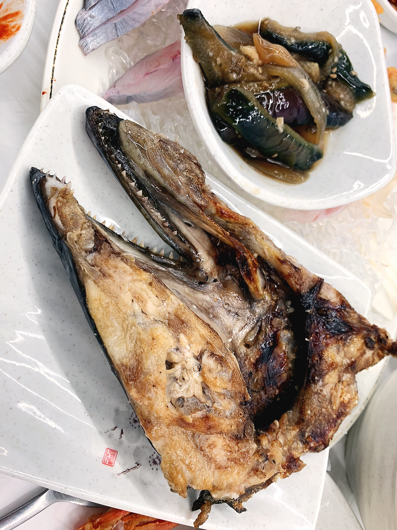 조일 식당은 튀김도 꼭 시켜야 한다. 새우튀김을 시키면 쑥, 고구마 같은 야채튀김도 같이 나온다. 쑥 튀김을 워낙 좋아해서 새우보다 쑥 튀김이 더 반가웠다..ㅎㅎ 새우도 야채도 전부 바삭하니 정말 맛있었다. 튀김은 언제나 옳으니까. 식사를 다 마칠 때쯤이면 삼치 머리 구이를 내주신다. 머리 부위인데도 살이 도톰하니 꽤 된다. 마무리로 매운탕을 기다리는데, 매운탕 메뉴가 없어졌다고 한다. 작년 방문 때 매운탕을 정말 맛있게 먹었었는데, 없어졌다니…! 여담이지만, 식사를 하다 보니 전에 테이블마다 다니시며 삼치회 먹는 법을 알려주시던 사장님은 안 보이시고, 뉴페이스의 사장님으로 추정되는 젊은 분이 보였다. 직원에게 슬쩍 물어보니 사장님 아들이 가게를 물려받으셨다고 한다. 물려받으시면서 리모델링과 함께 약간의 변화를 꾀하신 것 같다. 옛 노포가 주던 분위기가 없어져 살짝 아쉬웠지만, 새로운 조일식당의 앞날을 기대해본다.