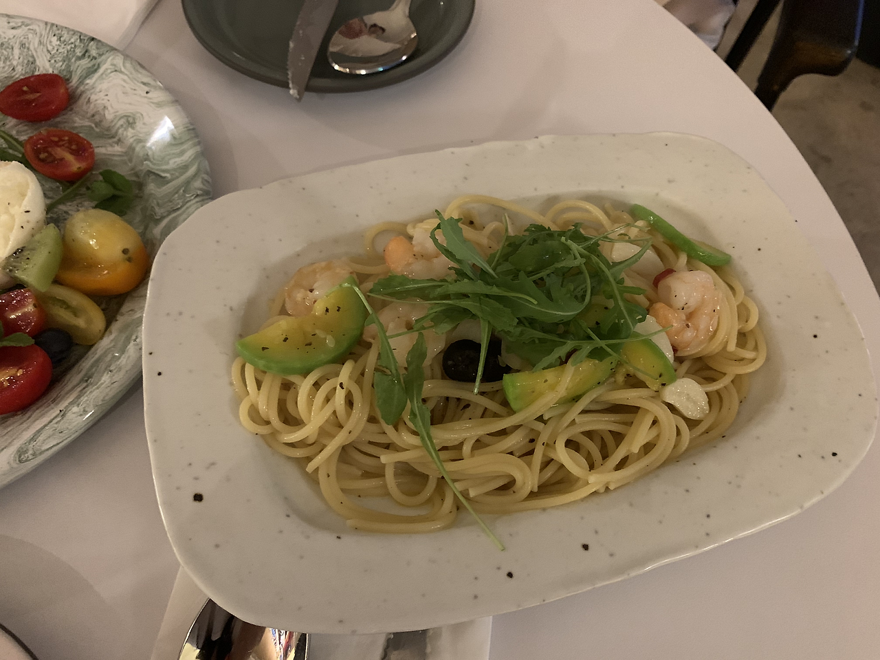우리는 가벼운 저녁을 먹으러 간 거여서 식사를 위한 안주를 시켰다. 과일 부라타 샐러드, 오일 파스타, 잠봉 플레이트에 샹그리아 한 잔을 시켰다. 차를 안 가져왔으면 와인을 먹는 거였는데, 아쉬운 대로 혼자 샹그리아 한 잔을 홀짝였다. 샹그리아는 직접 담그신다고 하셨는데, 맛이 정말 좋았다. 특별히 튀는 과일맛이 없이 새콤달콤 밸런스가 조화로웠다. 메뉴는 아무래도 식사용이 아닌 안주용이어서 양이 엄청 많지는 않다. 세 가지 메뉴를 시켰는데, 둘이서 적당히 배부르게 먹고 나왔다. 음식 맛은 나쁘지 않았다. 사실 주문한 메뉴들이 재료만 신선하면 맛없기도 힘든 메뉴들이다.(샐러드나 잠봉 플레이트는 사실 플레이팅만 잘하면 되는 메뉴 아닌가ㅎㅎ) 오일 파스타도 괜찮았다. 싱겁게 먹는 편인 나에게는 딱 좋은 간이었는데, 평균적인 입맛에서는 좀 싱겁다고 느낄 수도 있다. 집에서 해 먹는 파스타 맛이라 좋았다.