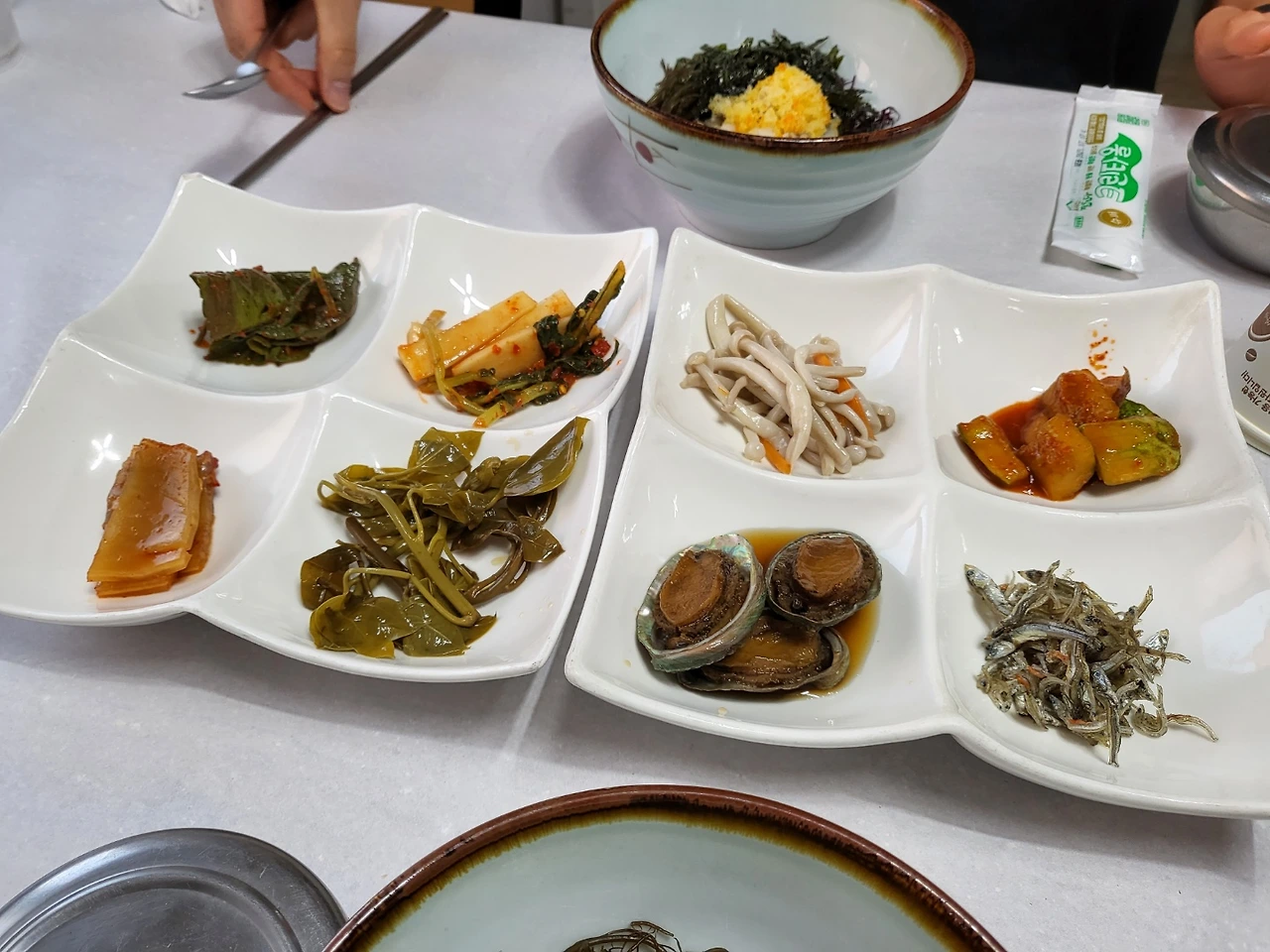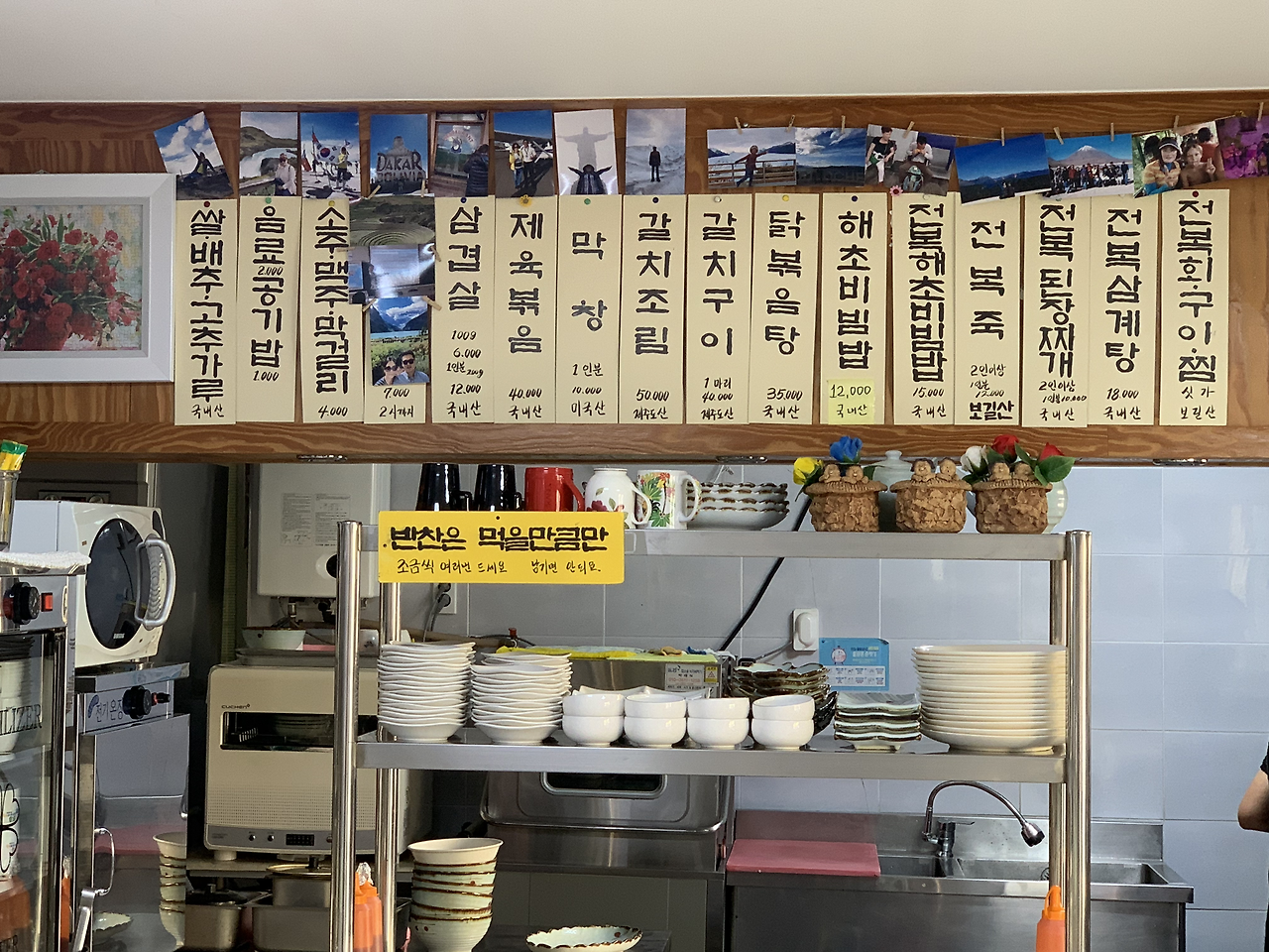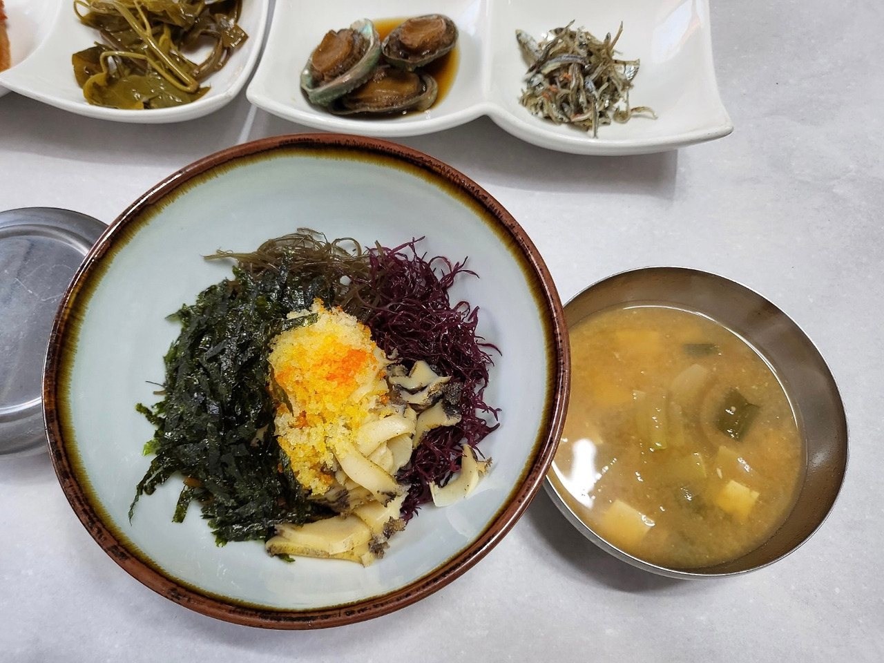 이 식당은 섬에 머무는 동안 갈까 말까를 10번 이상 고민한 집이다. 검색포탈에서 위생의 문제가 지적되어 있어 망설여졌는데, 동네 주민분들에게 괜찮을 식당을 물어보면 모두가 입을 모아 우리식당을 말했다. 찜찜한 마음을 가지고 점심식사를 하러 갔다. 메뉴는 굉장히 다양하다. 고민 끝에 전복 된장찌개와 제육볶음 중자를 시켰다. 가격은 만만치 않고, 공기밥도 추가 주문을 해야 한다. 음.. 굳이 길게 얘기하고 싶은 식당은 아니다. 점심시간 우리 식당은 섬에서 일하시는 분들로 바글바글했지만, 내 입맛에는 와닿지 않았다. 굉장히 투박한 맛이었다. 그렇다고 재료가 신선한 것도 아니었고. 몇몇 반찬은 요리한 지가 오래됐는지 군내가 났다. 그런데 가격은 서울 백반집의 두 배이니.. 유쾌한 식사는 아니었다. 생존을 위한 식사였다고 나를 위로할 수밖에.