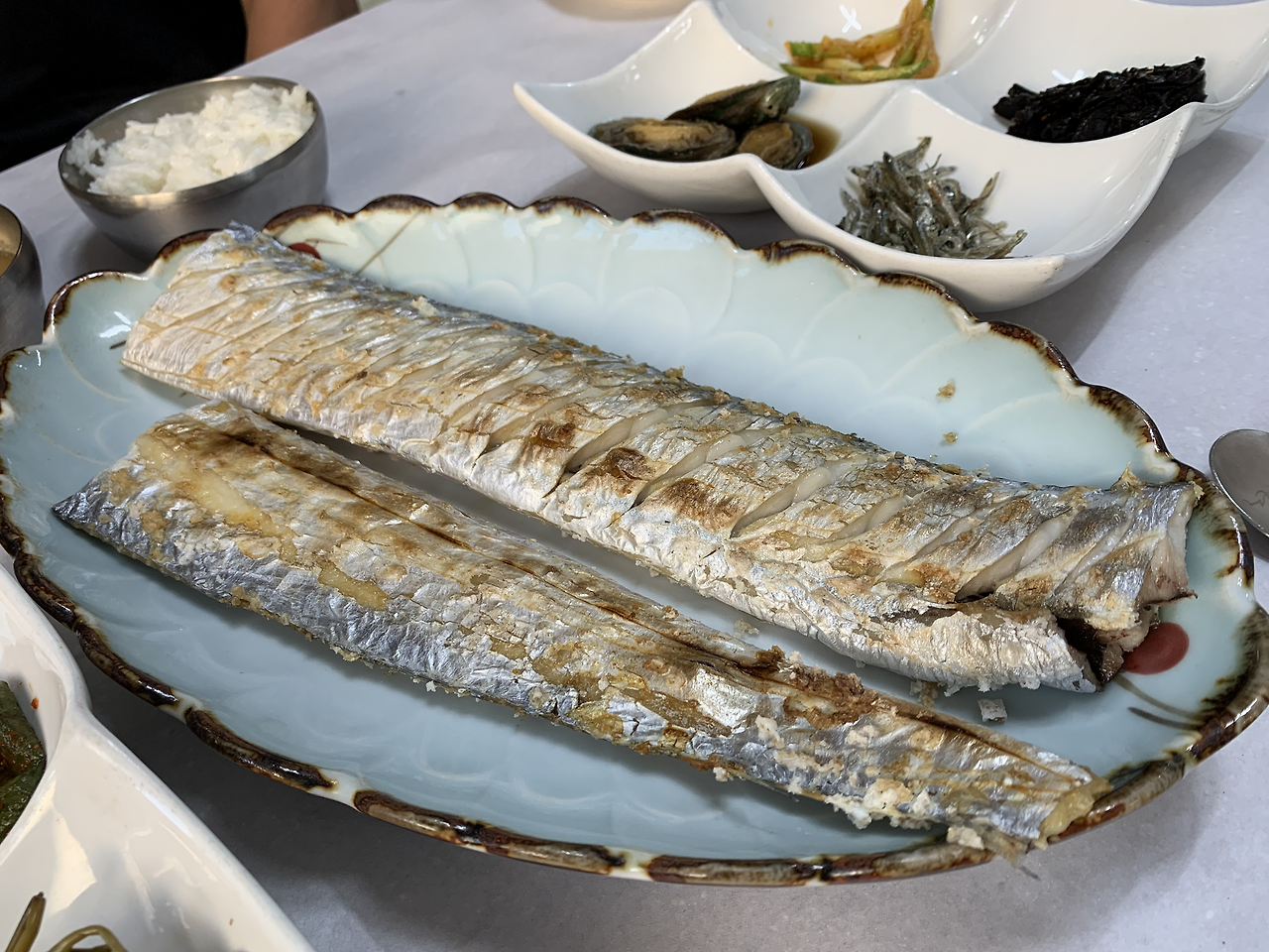 해초비빔밥을 먹은 다음 날 또 나무숲에 갔다. 전복회를 시키고 싶었는데, 사장님이 전복을 직접 취급하지 않으셔 1kg 이상부터만 주문이 가능하다고 하셨다. 시킬까 말까 고민을 하다가 둘이서 먹기에는 양이 너무 많을 것 같아 과감히 갈치구이를 주문했다. 친구는 보길도에서 제주도산 갈치구이를 먹는 것에 대해 우려를 표했지만 난 사장님에 대한 강한 믿음이 있었다. 그리고 제주도는 날이 맑으면 보길도에서 보일만큼 가까운 섬이기에 신선도도 의심치 않았다. 아니 뭐 삼겹살이나 닭이라 한들 보길도에는 다 배 타고 들어올 테니 크게 다를까. 20분 정도가 지나고 갈치구이가 나왔고, 친구의 우려와는 다르게 우리는 갈치에 갈채 박수를 보낼 수밖에 없었다. 일단 압도적인 크기에 놀랐다. 4만 원이라는 가격이 아깝지 않은 갈치 크기였다. 성인 둘이서 배불리 먹을 수 있는 양이였고, 얇고 바삭한 은갈치 껍질 속 부드러운 갈치 속살이 정말 일품이었다. 최근 몇 년 동안 먹은 갈치구이 중에 최고라고 할 만큼 맛있었다! 엄지 척을 부르는 맛이다.