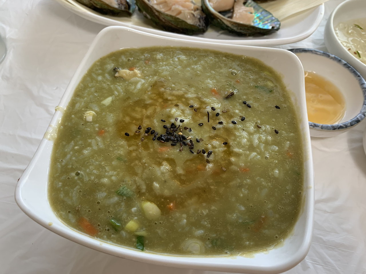 이 집은 섬에 들어온 첫날 보길도의 식당들이 문을 많이 닫아 노화도까지 내려와 들린 식당이다. 완도에 온 만큼 전복회를 먹으려고 이곳저곳을 기웃거리다 들어간 집이다. 우리는 전복회(40,000원)와 전복죽 특(15,000원) 2개를 시켰다. 전복회는 얼마나 시켜야 할지 감이 없어 사장님이 5만 원어치 시키라는 걸 4만 원어치만 달라고 했는데, 역시나 이것도 좀 많았다. 일단, 전복 자체는 알이 정말 실하고 신선했다. 전복 알이 정말 커서 전복회만 다 먹었는데도 배가 상당히 차올랐다. 문제는 전복회 외의 모든 것들이 실망스러웠다는 점이다. 일단 손님이 꽤나 안 왔던 건지 식당의 위생상태가 정말 문제가 많았다. 물과 물컵에서는 군내가 많이 나 예민한 친구는 손도 안 댔다…ㅎㅎ 나는 섬마을 식당의 위생에 대해 어느 정도 마음의 준비를 하고 왔기에 이해하려 했으나 전복죽에서 기분이 상해버렸다. 전복죽 일반과 특의 차이가 전복 양의 차이라고 해서 특으로 2인분을 시켰는데, 전복죽에 뿔소라를 섞으셨다. 뿔소라와 전복도 구분 못할 정도로 우리가 어리숙해 보였나.. 싱싱한 전복은 푹 끓여도 질기지 않고 툭툭 으스러지는데, 뿔소라는 질기다. 문제는 전복죽에 전복은 찾아보기 힘들고 뿔소라가 더 많았다는 점. 사장님께 말씀드릴까 하다가 이미 약주가 과하신 상태라 말없이 전복죽을 절반 이상 남기고 나왔다. 여행 와서 이렇게 바가지 쓰면 서러워진다.. 섬이라는 공간이 주는 육지와의 심리적 거리감 때문에 더욱 서러웠는지도 모르겠다.