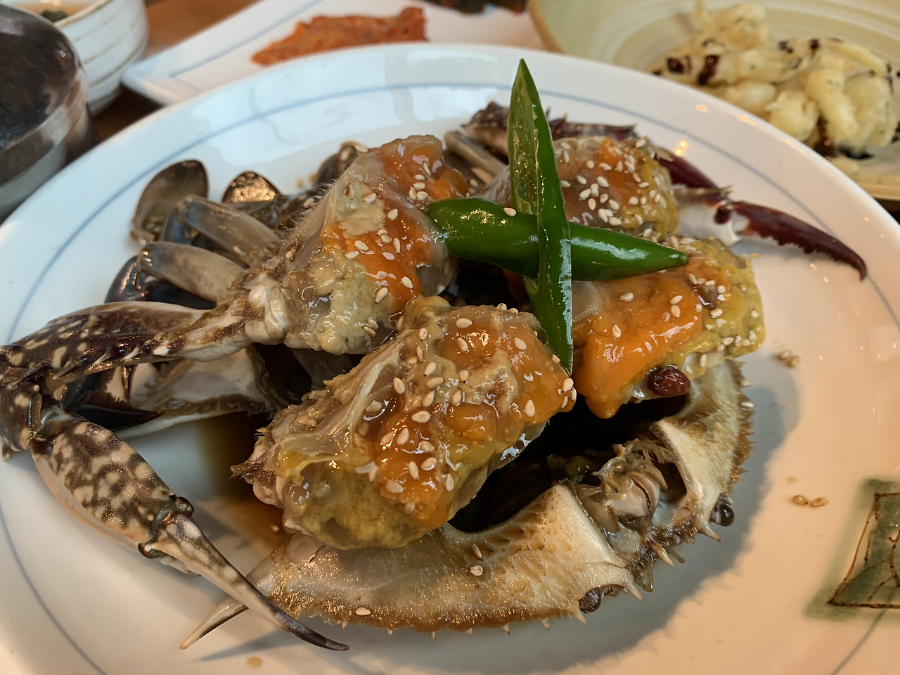 아쉬운 마음을 뒤로하고 여수 게장거리에서 유명한 황소식당에 다녀왔다. 사실 여긴 돌게장 전문점이라 가기 전부터 큰 기대를 하진 않았다. 꽃게와 돌게의 차이를 좀 말해보자면, 꽃게는 주로 깊은 바다(20-30미터?) 밑 모래에 서식한다. 돌게는 얕은 바다나 진흙, 돌에 서식해서 통발이나 낚시로 주로 잡는다. 꽃게와 돌게는 집게발이나 색깔로 구분하기도 하는데, 사실 크기만 봐도 벌써 차이가 크다. 꽃게장 돌게보다 훨씬 크다. 그만큼 안에 살도 많다. 가격 차이는 더 많이 난다. 원래 해산물이나 과일은 조금의 차이로 가격이 두배 이상 뛰기에.. 사실 게는 겨울이 제철인데, 사실 게장은 잡히자마자 요리해 급속냉동을 시키기 때문에 계절에 크게 구애받지 않는 음식이다.