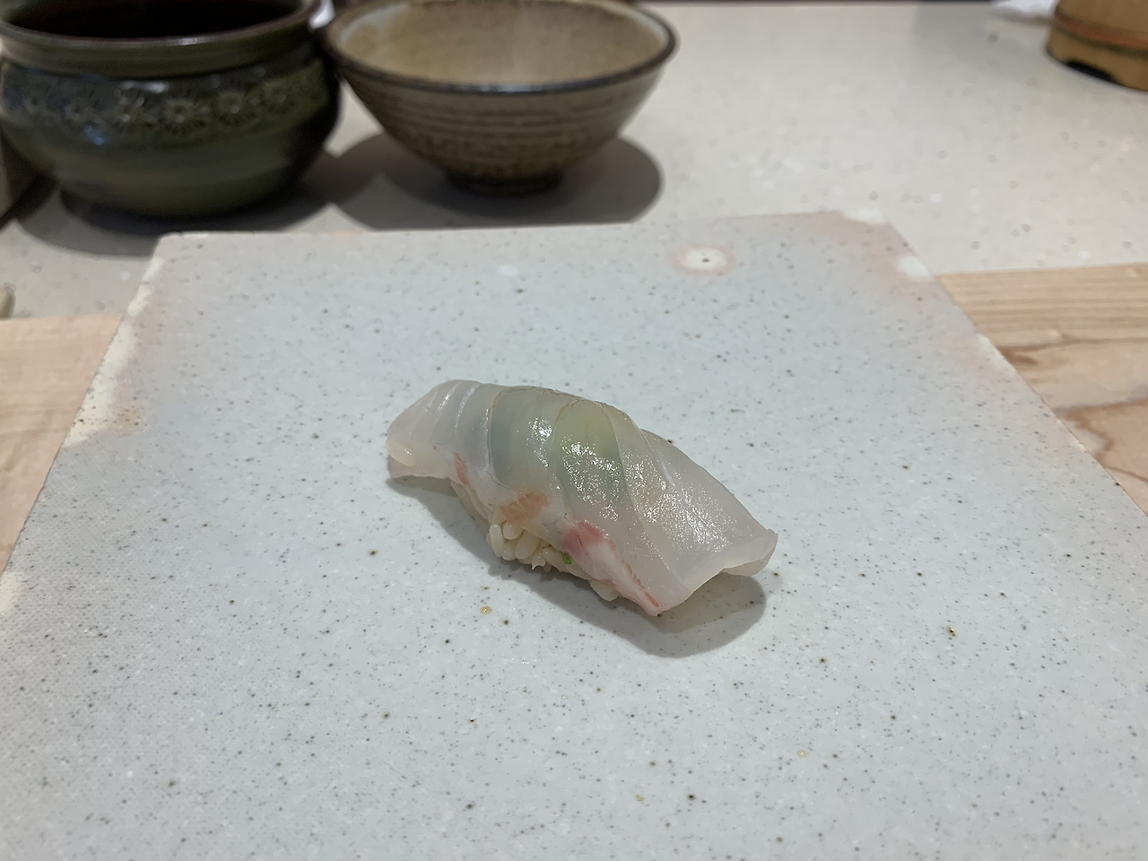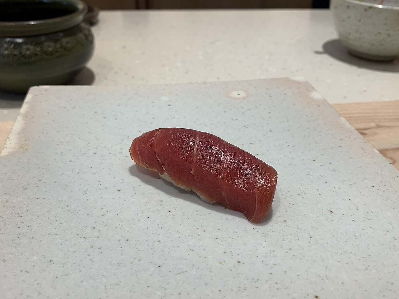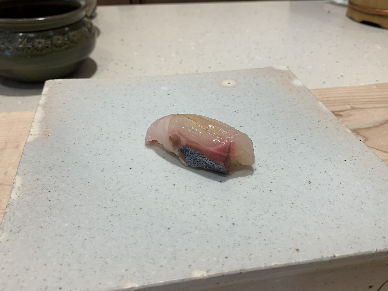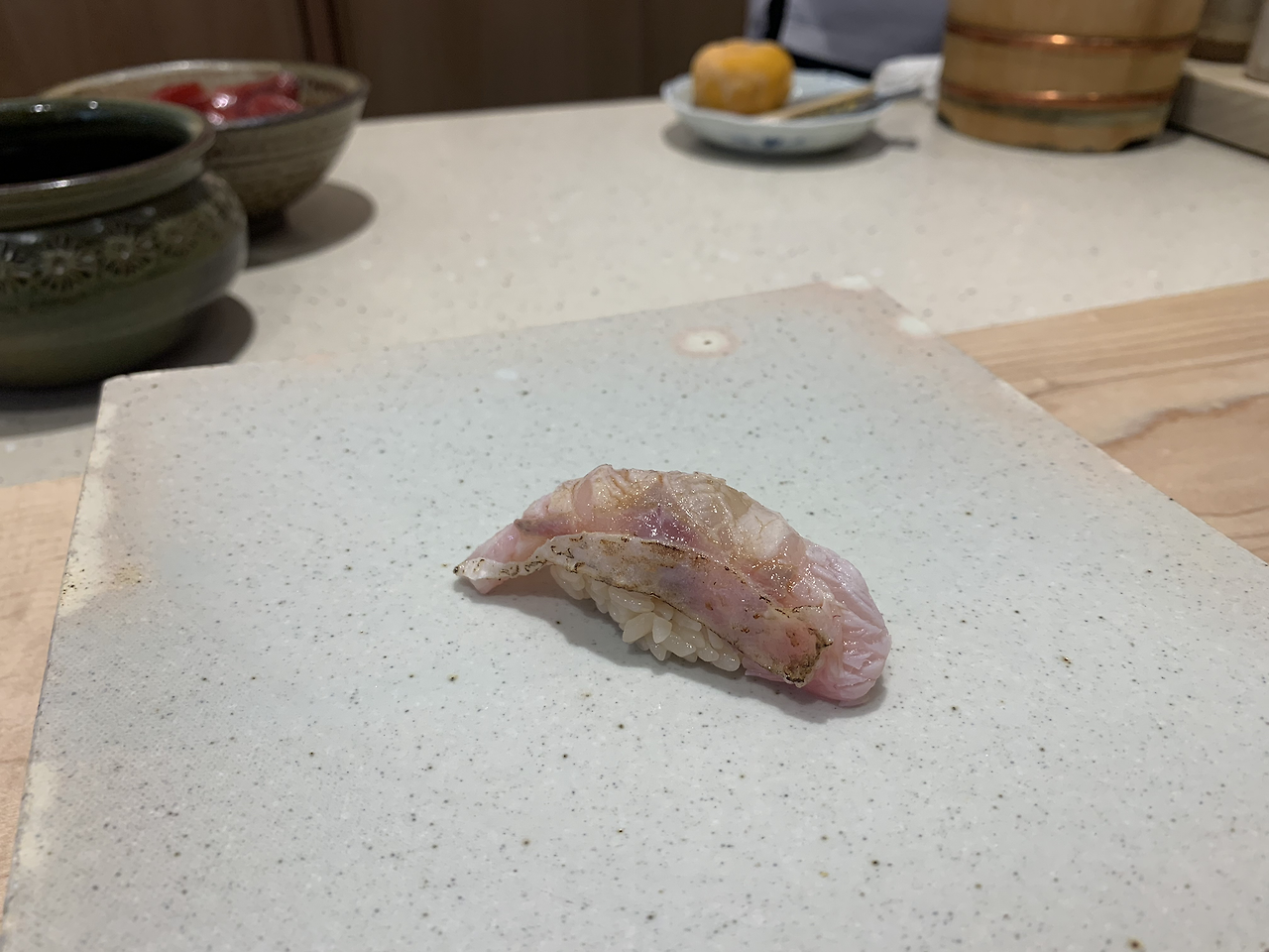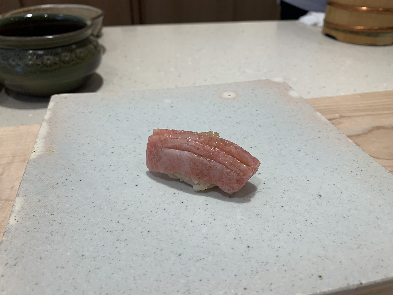 본격 스시파트가 시작됐다. 7번째 스시는 참돔스시. 밥을 안 좋아하는 편이라 보통 스시집에 가면 밥무덤을 지어놓곤 하는데, 참돔 스시에서 밥을 덜어내는 걸 보시고, 셰프님이 밥양 조절을 원하시면 말해달라고 말해주셨다. 밥양을 좀 적게 부탁드렸더니 바로 조절해 주셨다. 한 접시 한 접시 정성스럽고 세심하게 준비해 주시는 것 같아 기분이 좋아졌다. 다음으로 줄무늬전갱이 스시가 나왔다. 처음 먹어본 생선인데, 방어보다 좀 더 쫄깃한 식감이었다. 다음으로는 탑 3에 들었던 생참치 대뱃살 스시(1위는 단새우, 2위가 참치대뱃살, 3위가 성게알 김말이다..ㅋㅋ). 생참치는 쉽게 만나기 어려운데, 입에서 살살 녹았다.