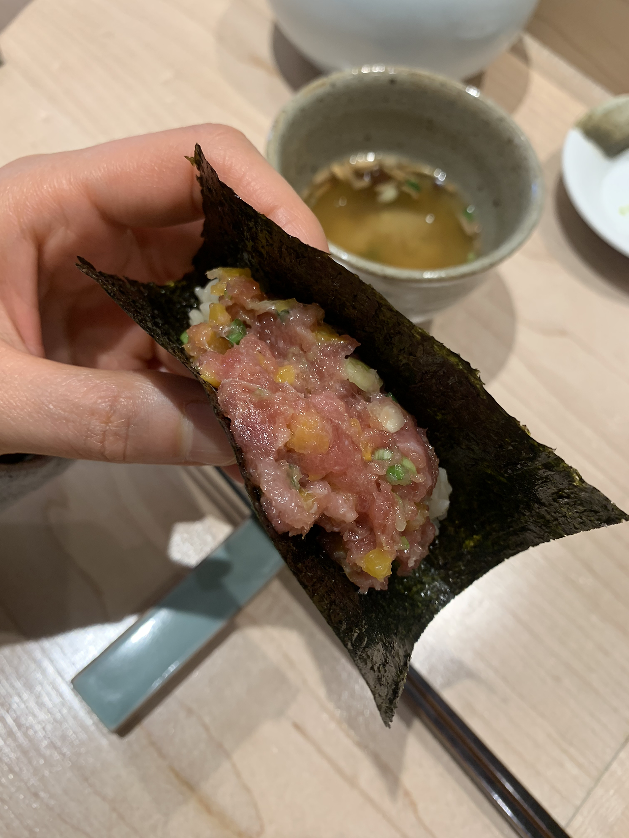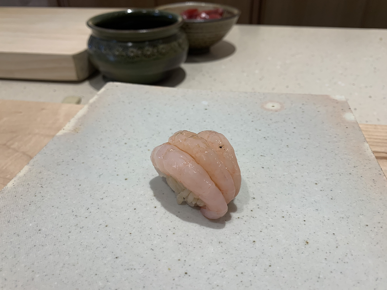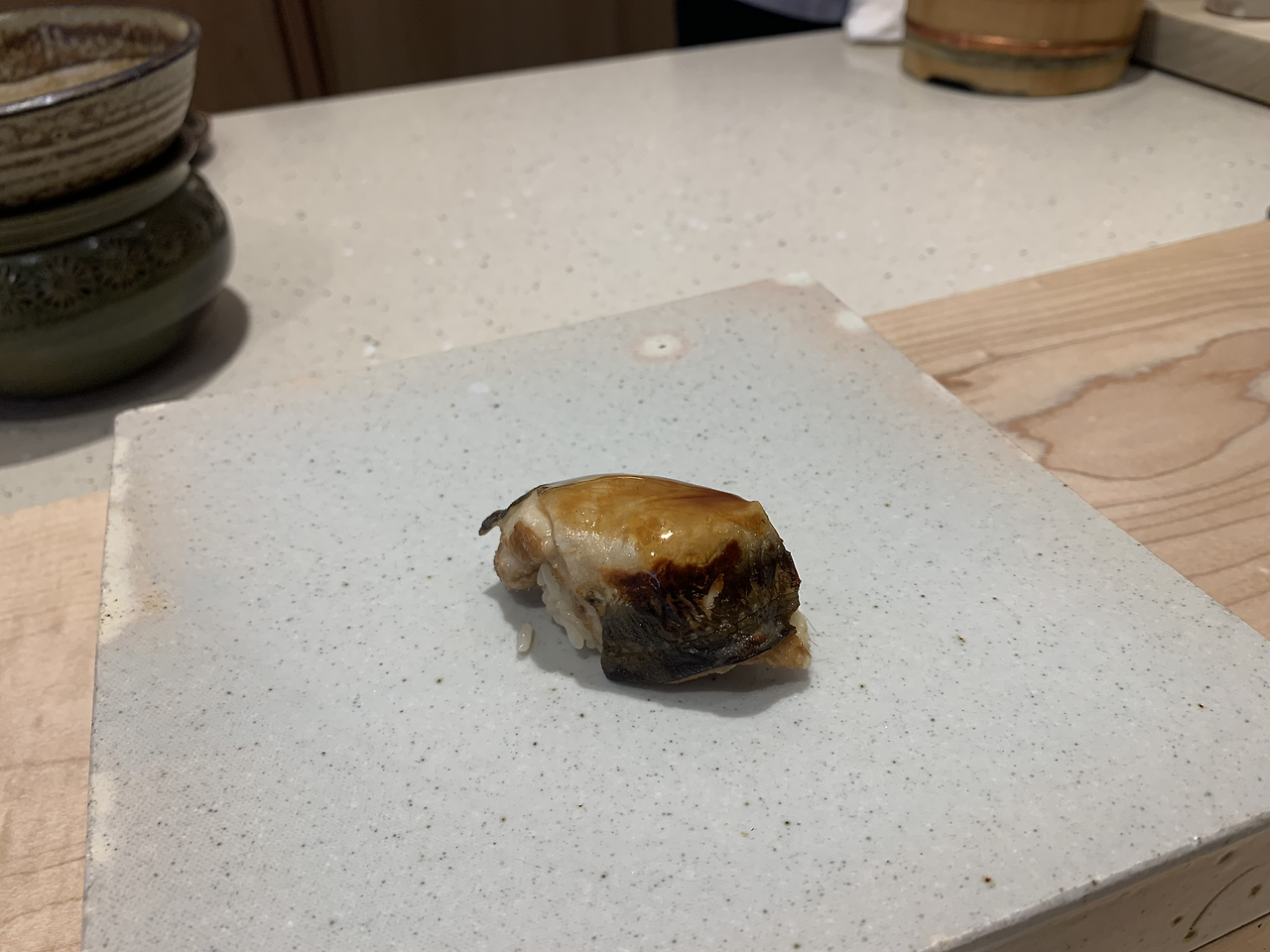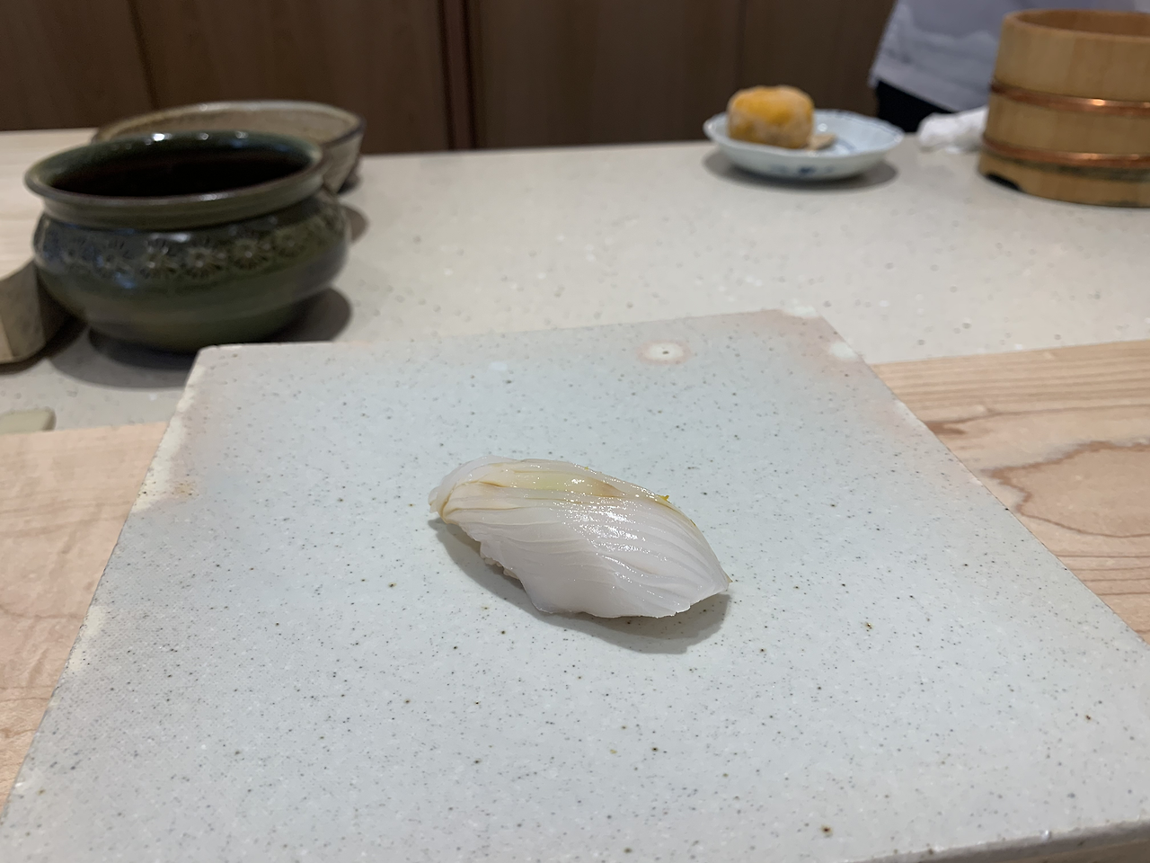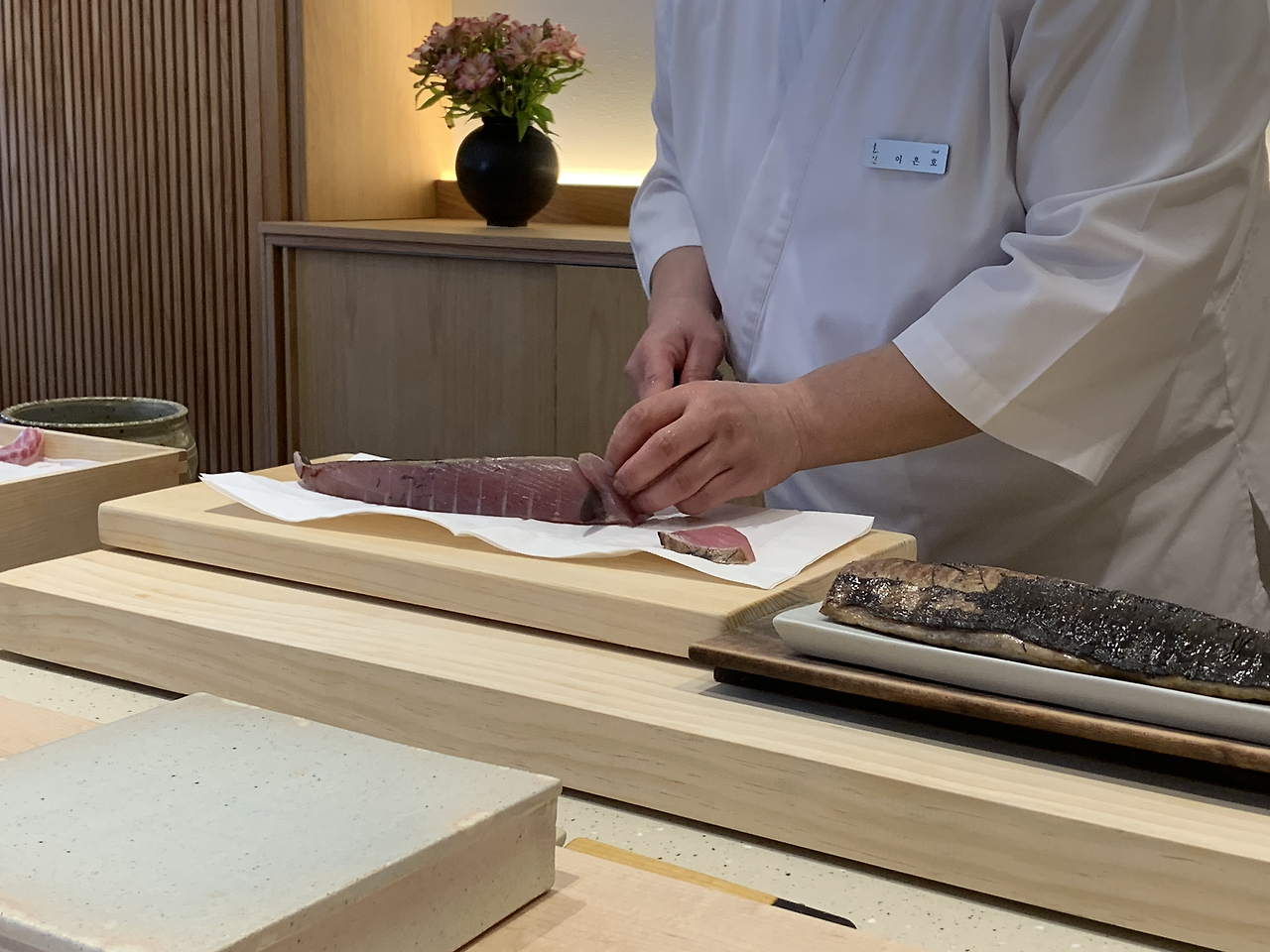본격 스시파트가 시작됐다. 7번째 스시는 참돔스시. 밥을 안 좋아하는 편이라 보통 스시집에 가면 밥무덤을 지어놓곤 하는데, 참돔 스시에서 밥을 덜어내는 걸 보시고, 셰프님이 밥양 조절을 원하시면 말해달라고 말해주셨다. 밥양을 좀 적게 부탁드렸더니 바로 조절해 주셨다. 한 접시 한 접시 정성스럽고 세심하게 준비해 주시는 것 같아 기분이 좋아졌다. 다음으로 줄무늬전갱이 스시가 나왔다. 처음 먹어본 생선인데, 방어보다 좀 더 쫄깃한 식감이었다. 다음으로는 탑 3에 들었던 생참치 대뱃살 스시(1위는 단새우, 2위가 참치대뱃살, 3위가 성게알 김말이다..ㅋㅋ). 생참치는 쉽게 만나기 어려운데, 입에서 살살 녹았다.