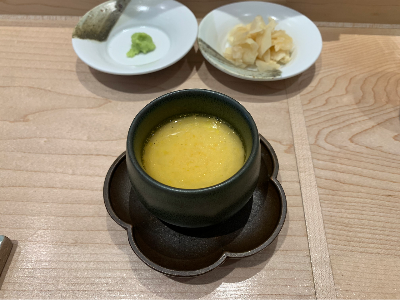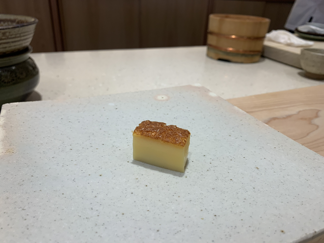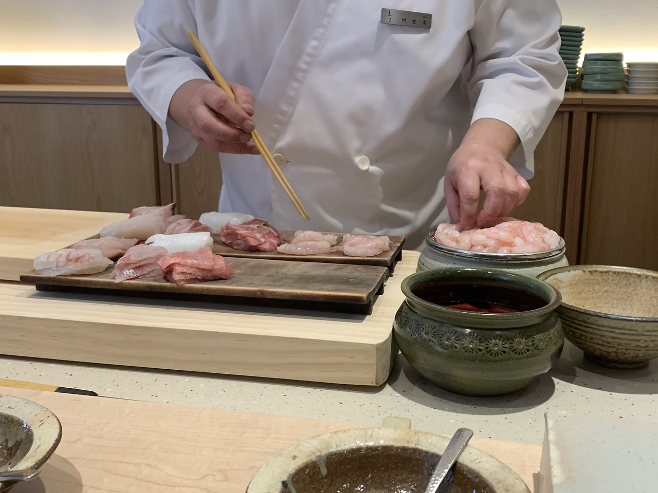 런치 오마카세는 1인 80,000원인데, 구성은 21 접시가 나온다. 점심 한 끼로는 충분한 양이다. 애피타이저로 나온 첫 접시는 계란찜이었다. 가쓰오부시 국물에 고다치즈가 올라갔는데 짭조름하면서도 치즈의 고소함이 따뜻하게 올라와 식욕이 돋았다. 문어조림 두 피스가 나오고 자연산 광어 사시미가 나왔다. 셰프님이 속초 바다에서 잡아 올린 6킬로짜리 자연산 광어라고 설명해 주셨다. 처음에는 소금을 찍어서, 다음엔 폰즈 유자소스를 찍어 먹어보라고 권해주셨는데, 개인적으로는 소금 간 사시미가 더 맛있었다. 사시미를 소금에 찍어먹은 건 처음이었는데, 사시미 본연의 맛을 더 잘 느낄 수 있는 조화였다. 나중에 집에서 먹을 때 참고해야겠다.