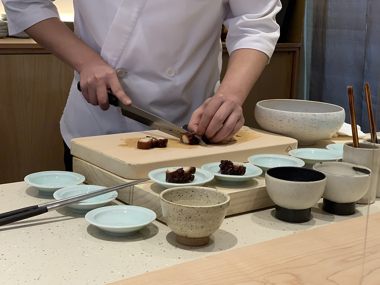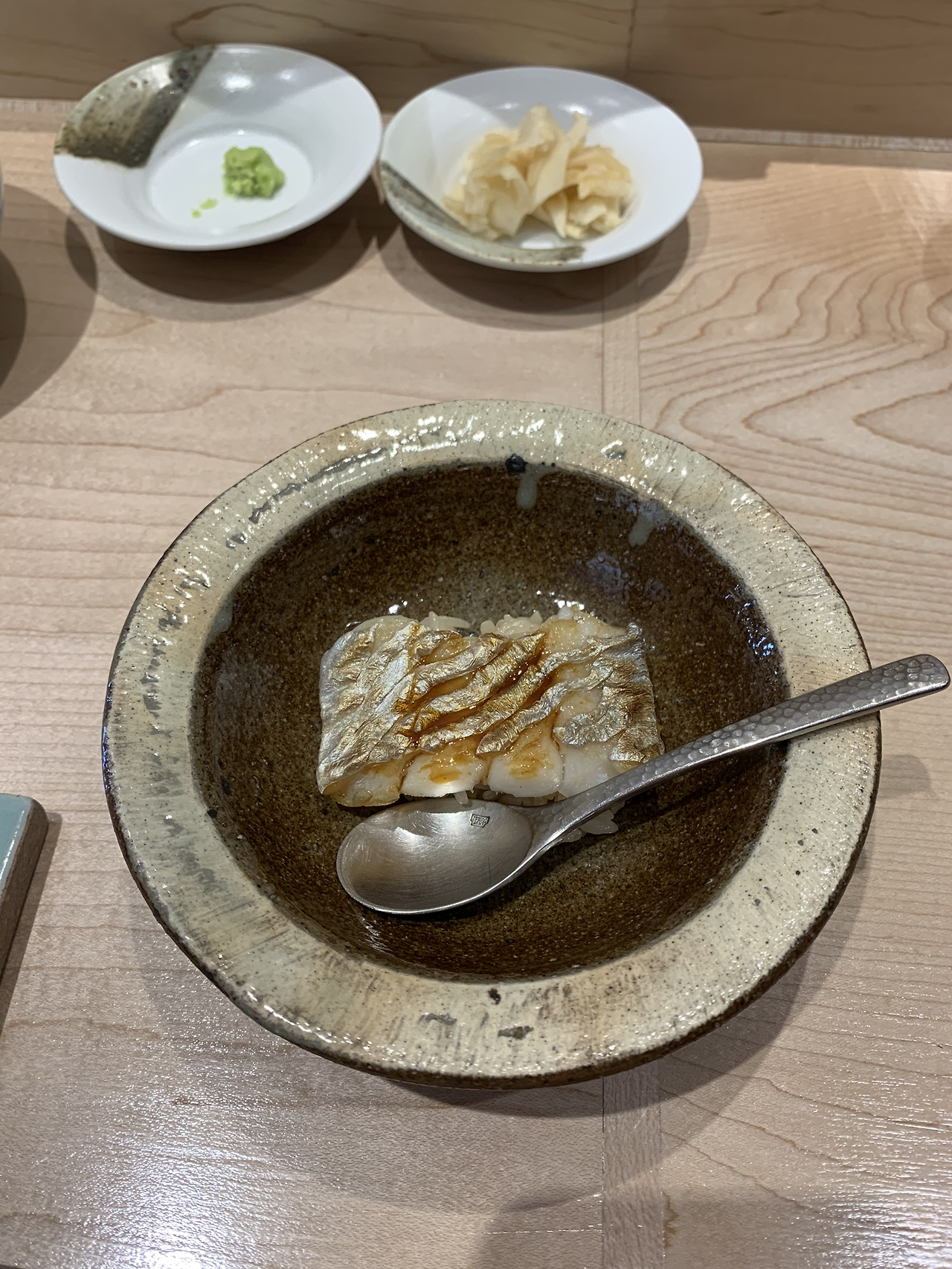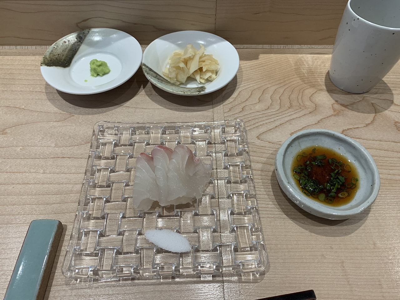 런치 오마카세는 1인 80,000원인데, 구성은 21 접시가 나온다. 점심 한 끼로는 충분한 양이다. 애피타이저로 나온 첫 접시는 계란찜이었다. 가쓰오부시 국물에 고다치즈가 올라갔는데 짭조름하면서도 치즈의 고소함이 따뜻하게 올라와 식욕이 돋았다. 문어조림 두 피스가 나오고 자연산 광어 사시미가 나왔다. 셰프님이 속초 바다에서 잡아 올린 6킬로짜리 자연산 광어라고 설명해 주셨다. 처음에는 소금을 찍어서, 다음엔 폰즈 유자소스를 찍어 먹어보라고 권해주셨는데, 개인적으로는 소금 간 사시미가 더 맛있었다. 사시미를 소금에 찍어먹은 건 처음이었는데, 사시미 본연의 맛을 더 잘 느낄 수 있는 조화였다. 나중에 집에서 먹을 때 참고해야겠다.