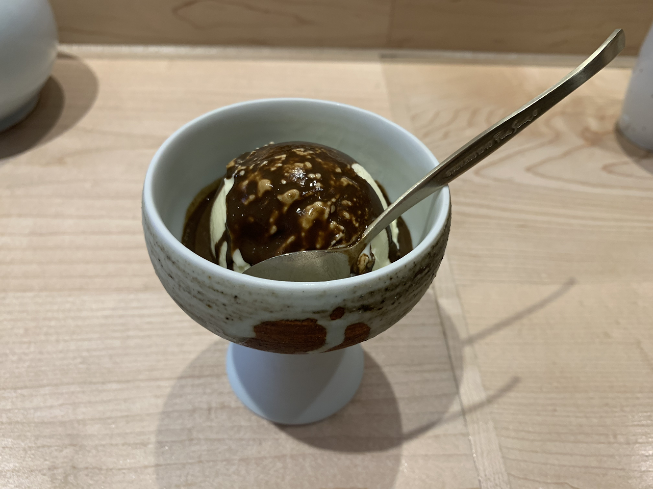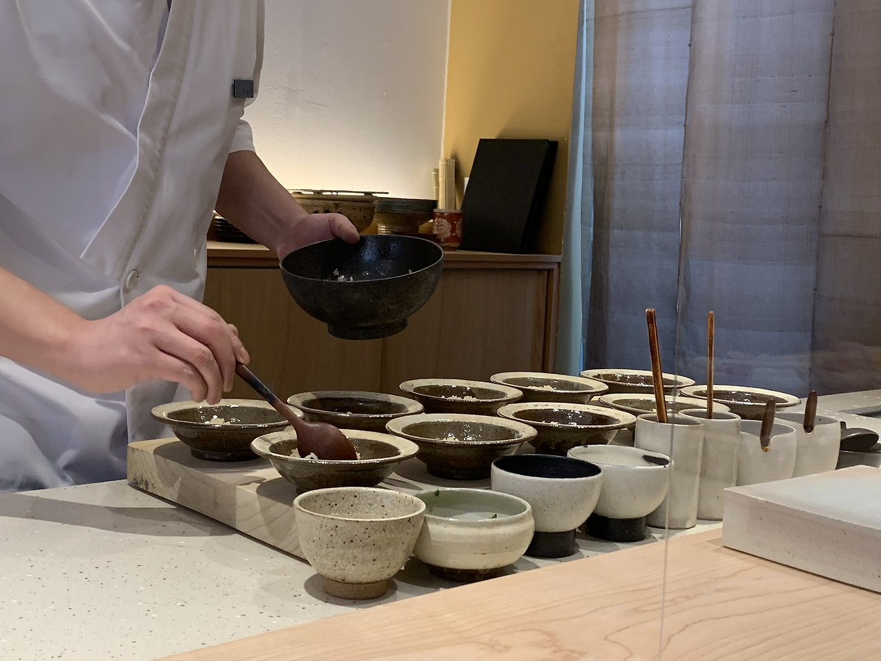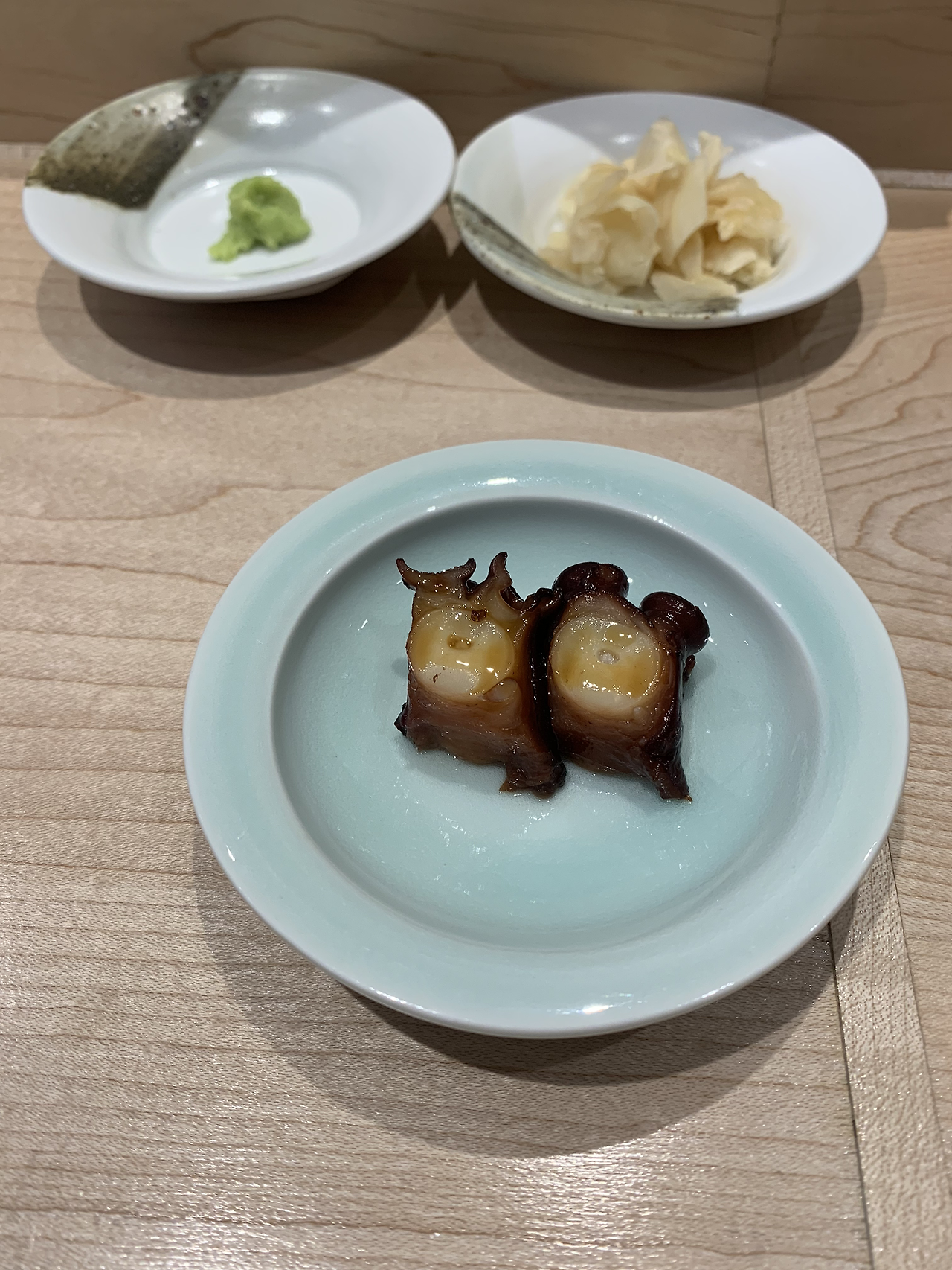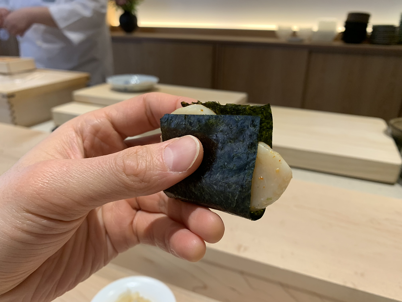 10번째 접시는 유자껍질이 올라간 무늬오징어. 맛도 맛이지만, 바로 앞에서 셰프님이 오징어에 칼집 내는 모습을 보는 재미가 쏠쏠했다. 다음은 키조개 관자 김말이. 중간에 미소장국이 나왔다. 미소를 즐겨 먹지 않는데, 미소향이 강하지 않고 버섯향이 은은하게 남아서 미소 한 사발을 뚝딱했다.
