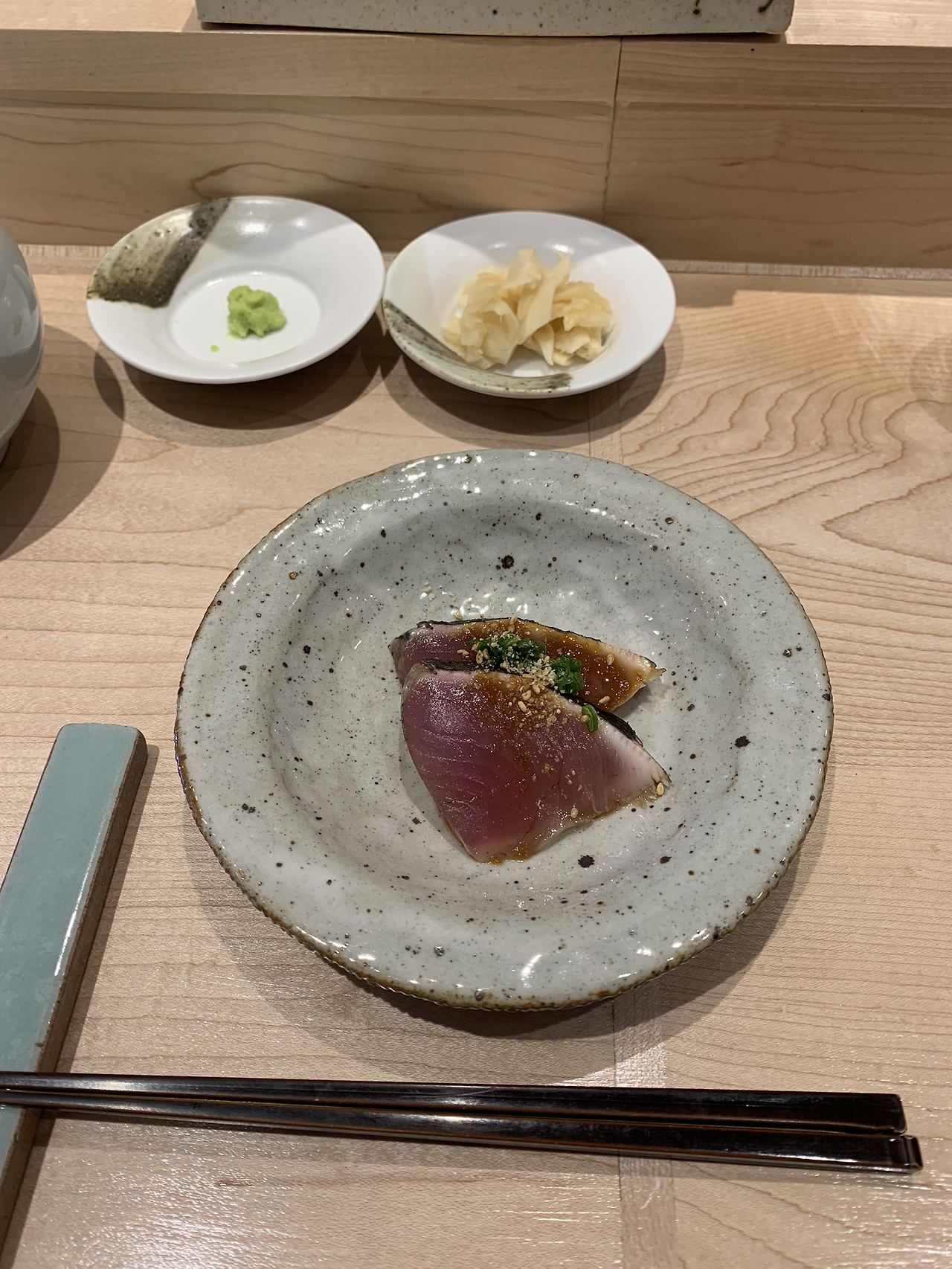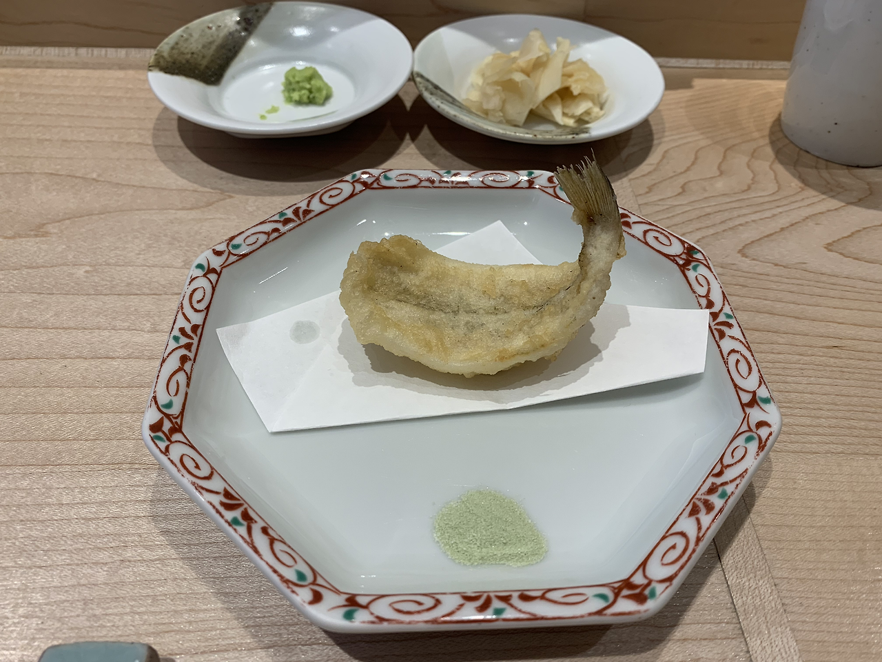 네 번째 접시는 껍질만 짚불에 익힌 새끼 참다랑어가 나왔다. 위에는 마늘 간장소스가 올려져 나왔다. 훈연한 음식을 별로 좋아하는 편은 아니라 쏘쏘 했다. 다섯 번째는 제주산 은갈치 초밥이 나왔다. 초밥 위에 구운 갈치 한 덩이가 올려 나오는데, 으깨서 먹는 방식이다. 제일 좋아하는 생선구이가 갈치인데, 맛있었다! 여섯 번째 접시는 보리멸 튀김이 나왔는데, 곁들여 먹는 녹차소금이 인상 깊었다.(생각보다 녹차향이 세진 않았다)