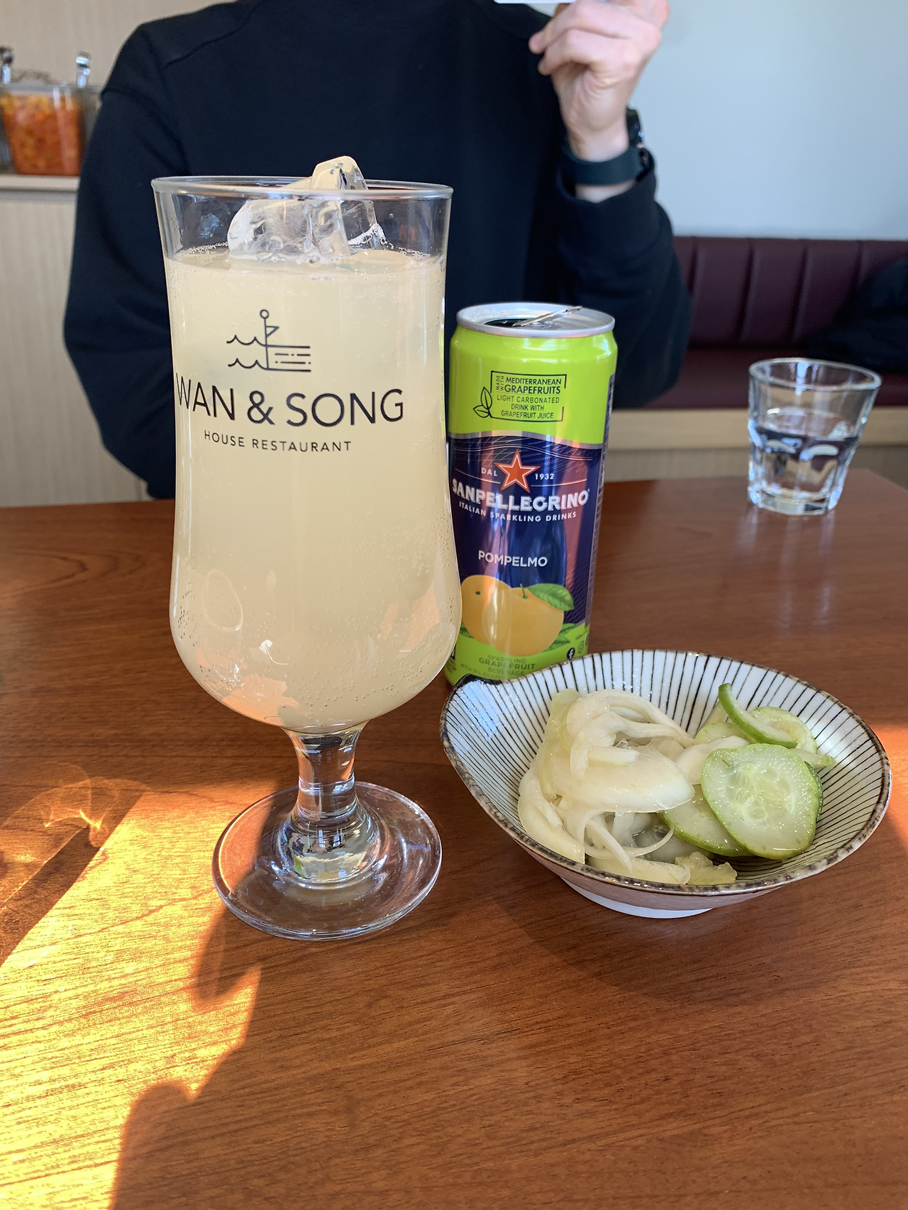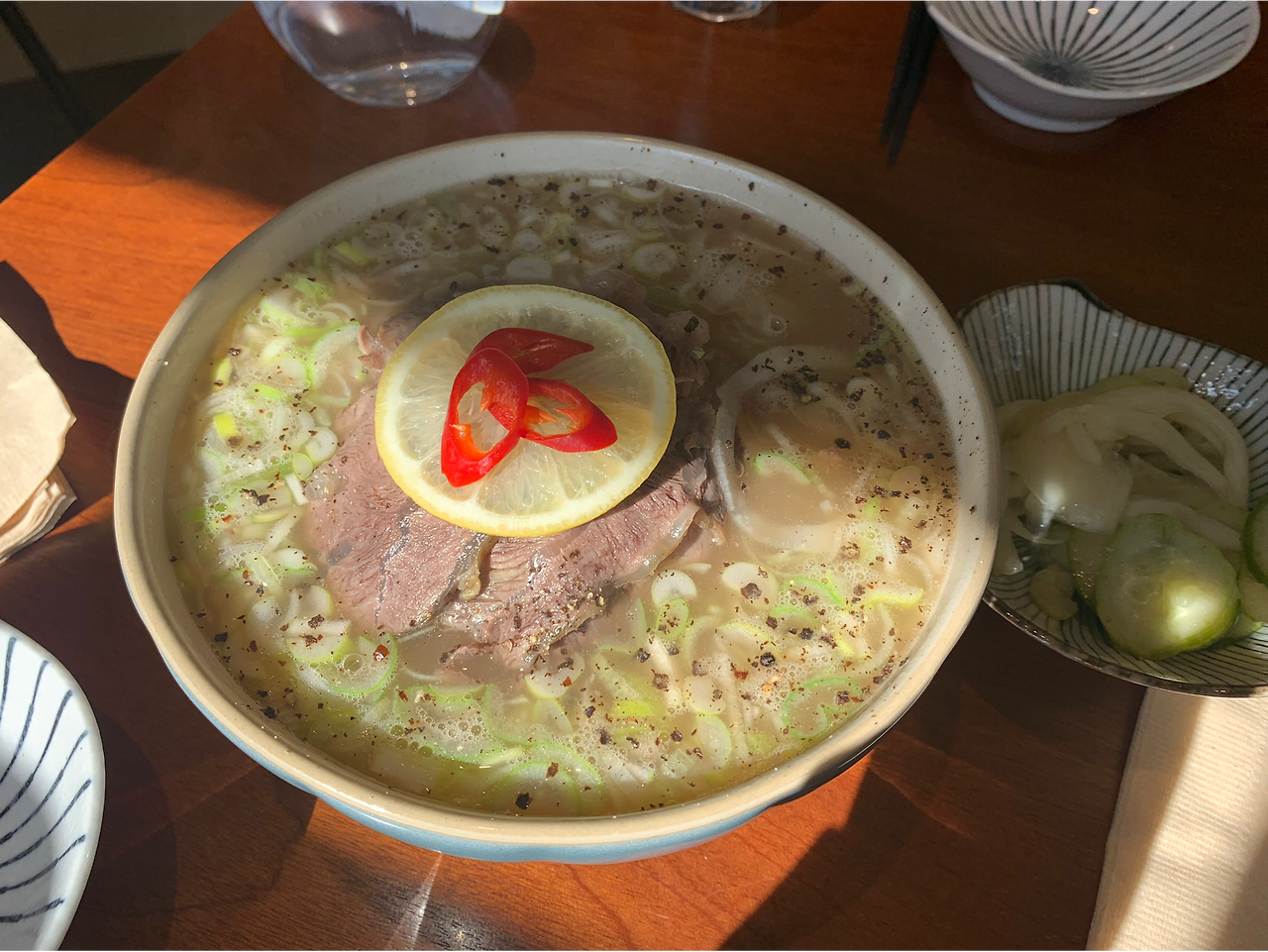 쌀국수 맛집으로 알려진 곳인데 메뉴는 꽤 다양했다. 사실 그래서 정체성을 알기 좀 어려웠다. 쌀국수, 아롱사태국밥, 치킨티카마살라, 일본식 타코라이스, 누들샐러드.. 여기가 베트남인지 인도인지 일본인지 멕시코인지..ㅎㅎ 그래도 기대를 가지고 소고기 쌀국수와 타코라이스를 시켰다. 음료는 산펠레그리노 그린자몽을 시켰는데, 마시다 보니 고수를 넣으면 쌉싸름한 맛이 추가되어 더 상큼할 것 같았다. 동행자가 이상할 것 같다고 했지만, 나의 직감을 믿고 넣었는데 정말 맛있었다.(동행자도 맛있다고 계속 마심) 쌀국수와 잘 어울리는 맛이었다.