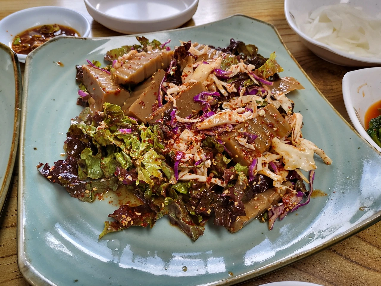 2월 강원도 여행의 첫끼를 청대리막국수로 시작했다. 청대리 막국수에서 100% 메밀면으로 만든 토면을 맛본 이후로는 다른 막국수집에 잘 안 가게 된다. 아쉽게도 여행파티원이 2명이어서 고심 끝에 토면, 도토리묵, 감자전을 시켰다. 토면은 양이 적으면 아쉬울 것 같아 곱빼기 주문이 가능하냐 여쭈었더니 된다고 하셔서 망설임 없이 곱빼기로 시켰다. 둘이 가서 시킬 수 있는 최선의 타협점이다. 토면이 나오기 전 도토리묵과 감자전이 먼저 나왔다. 인생 감자전, 도토리묵까지는 아니지만 훌륭한 맛이다. 저 날은 도토리 묵보다도 도토리 묵에 들어간 상추 겉절이가 더 맛있었다.. 감자전 한 입 도토리묵 한 입 정신없이 먹다 보니 토면이 나왔다. 메밀싹이 올라만 순 메밀면은 올 때마다 먹어도 질리지가 않는다. 고소하면서도 달콤 짭조름한 사장님 특제소스는 메밀향과 정말 잘 어울린다. 적은 양이 아닌데도 늘 아쉬움을 남기는 맛이다.
