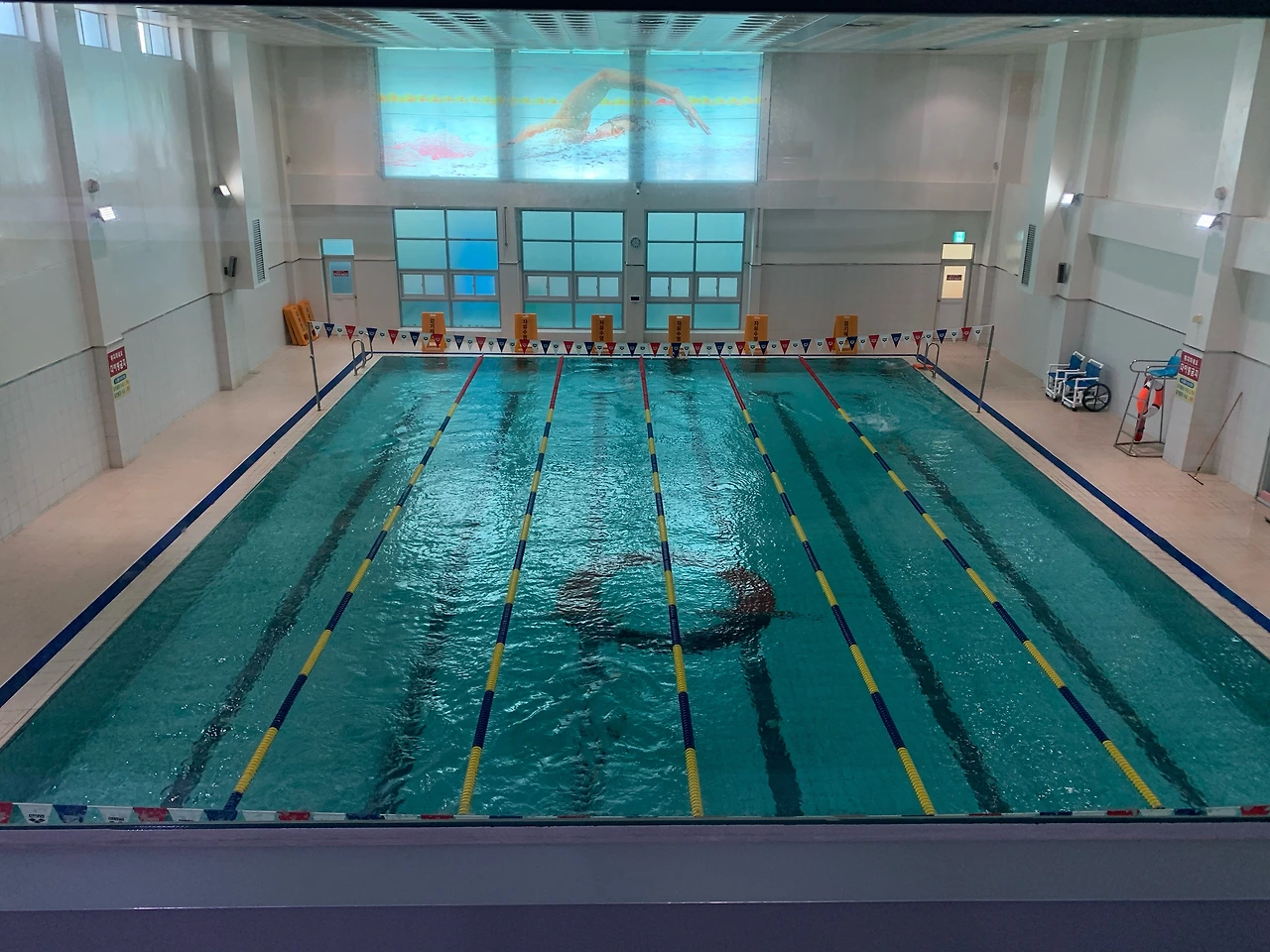 본격 수영장 얘기로 들어가서, 수영장 스펙은 길이 25미터, 수심 1.2미터의 6 레인의 경영풀이 있고, 여기 더해 잠수풀과 유아풀도 있다. 일반적인 수영장 스펙인데, 이 수영장의 최대 장점은 소나무 숲이 보이는 통유리창 수영장이라는 점이다. 낮에 소나무 숲 사이로 들어오는 햇볕 사이로 수영을 하고 있으면 그렇게 비현실적일 수가 없다.ㅋㅋ 수질은 깨끗한 편이다. 항상 평일에만 가봐서 주말에는 어떤지 모르겠으나 사람은 없는 편이다. 걷기 레일을 이용하는 어르신들은 늘 많은데, 레일에서 수영하시는 분들은 적은 편이다. 주로 점심 혹은 이른 오후에 갔는데, 한 레일에 두 세 사람 정도라 여유 있게 연습할 수 있다. 오히려 아침 시간(7시)에 갔을 때, 강습 때문에 사람이 더 많았다.