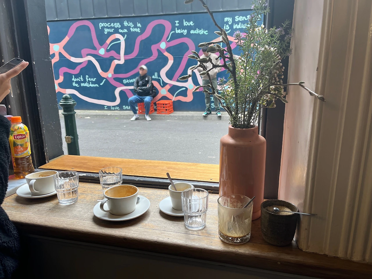 평일 오전(10시경)에 갔는데, 손님이 은근히 있었다. 짧은 줄을 선 끝에 커피를 시키고, 매장 내 스탠딩 바에 자리를 잡았다. 이날도 나는 어김없이 플랫화이트를 시키고, 디저트로 피스타치오 미니케이크를 시켰다. 멜버른에서 먹었던 플랫화이트 중에 가장 기억에 남는다. 부드럽지만, 진하고 꼬수웠다. 피스타치오 케이크도 맛있었다. 고소한 피스타치오 속에 꾸덕하고 달달한 필링이 참 맛있었다. (사실 좀 달아서 롱브랙과 먹으면 최고일 것 같다는 생각이 들었다) 인기 있는 카페여서 정신이 없는데도 불구하고 바리스타 분들이 굉장히 친절했다. 어쩌다 보니 바리스타와 마주 보는 스탠딩 바에서 커피를 마셨는데, 혼자 온 내가 안 됐는지 계속 안부를 물어줬다. 가게를 나서면서 멜버른에 머무는 동안 꼭 한 번 다시 오겠다고 다짐했는데, 결국은 재방문을 못해 지금 글을 쓰는 이 순간에도 아쉬움이 크다..