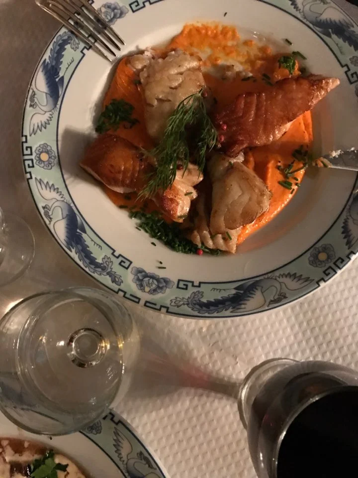 스타터가 거의 메인요리처럼 나와 나는 스타터와 메인요리가 같이 나온 줄 알고 스타터만 먹는데 거의 1시간을 소비했다. 파리지엥은 상대방의 의견을 많이 존중하는지라 빨리 먹으라고 하지 않고 인내심을 갖고 기다린다. 이런. 메인요리가 나와서야 "어게인(again?)"을 외치며 또 요리가 있었냐고 물었다. 맙소사. 스타터가 거의 메인 요리처럼 나와서 정말 몰랐다. 천천히 조금씩 와인과 곁들여 담소를 나누며 먹다 보니 저녁시간이 훌쩍 지나갔다. 우리나라로 치면 한정식이랄까.