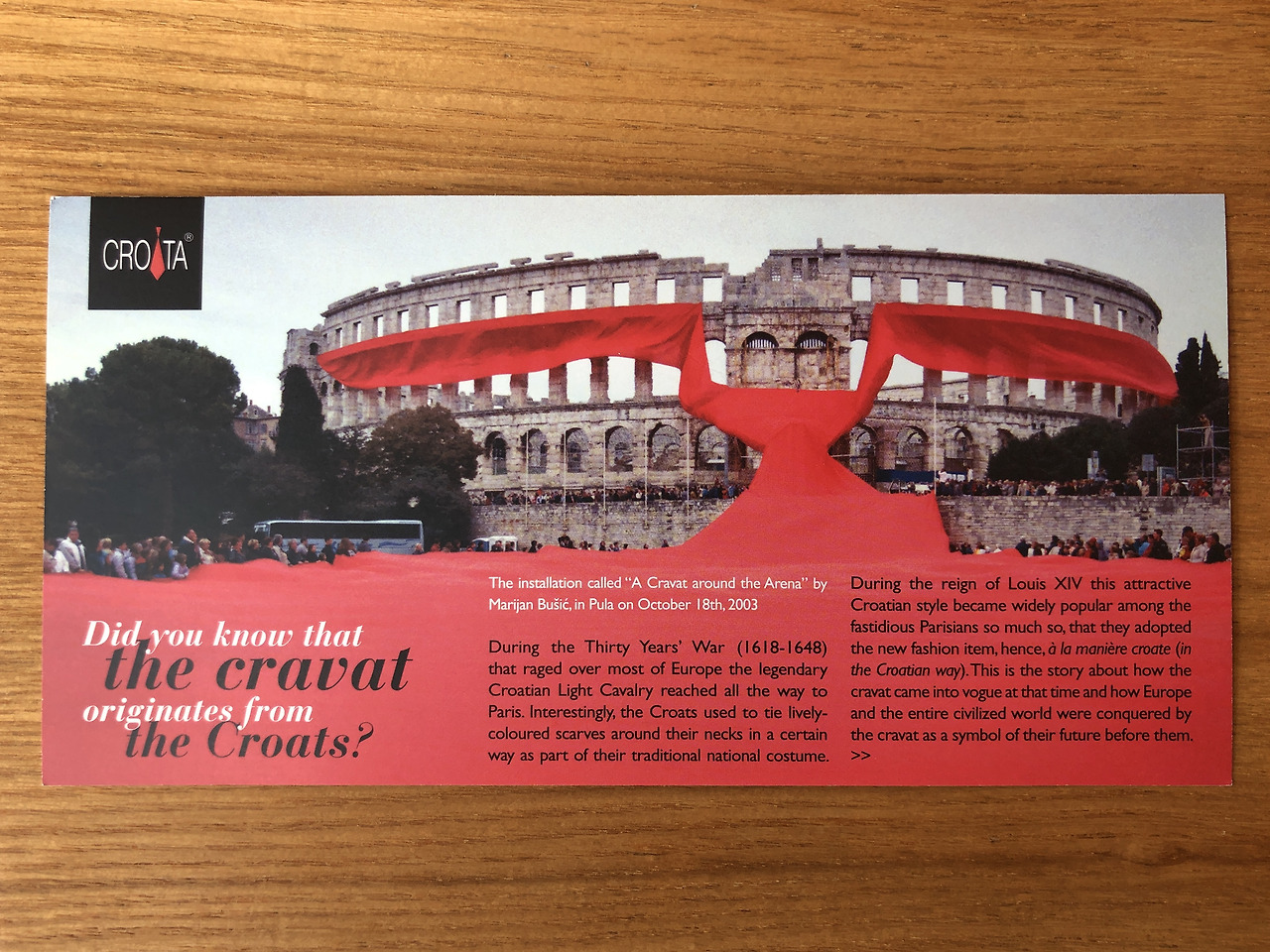 크로아티아의 풀라 로마 원형 경기장 아레나 Arena에서는 세계에서 가장 큰 넥타이 행사가 2003년 10월 18일에 30년간의 전쟁(1618-1648) 동안 프랑스 참전 용사가 되어야 했던 크로아티아의 젊은 청년들을 기리기 위해 열렸다. 그 당시 크라바트를 매고 참전했던 것을 보고 프랑스에서 따라 매기 시작한 것이 넥타이의 원조가 되었다. 크라바트 넥타이 숍에서 얻은 포스트 카드로 그때 상황을 대신 전한다.