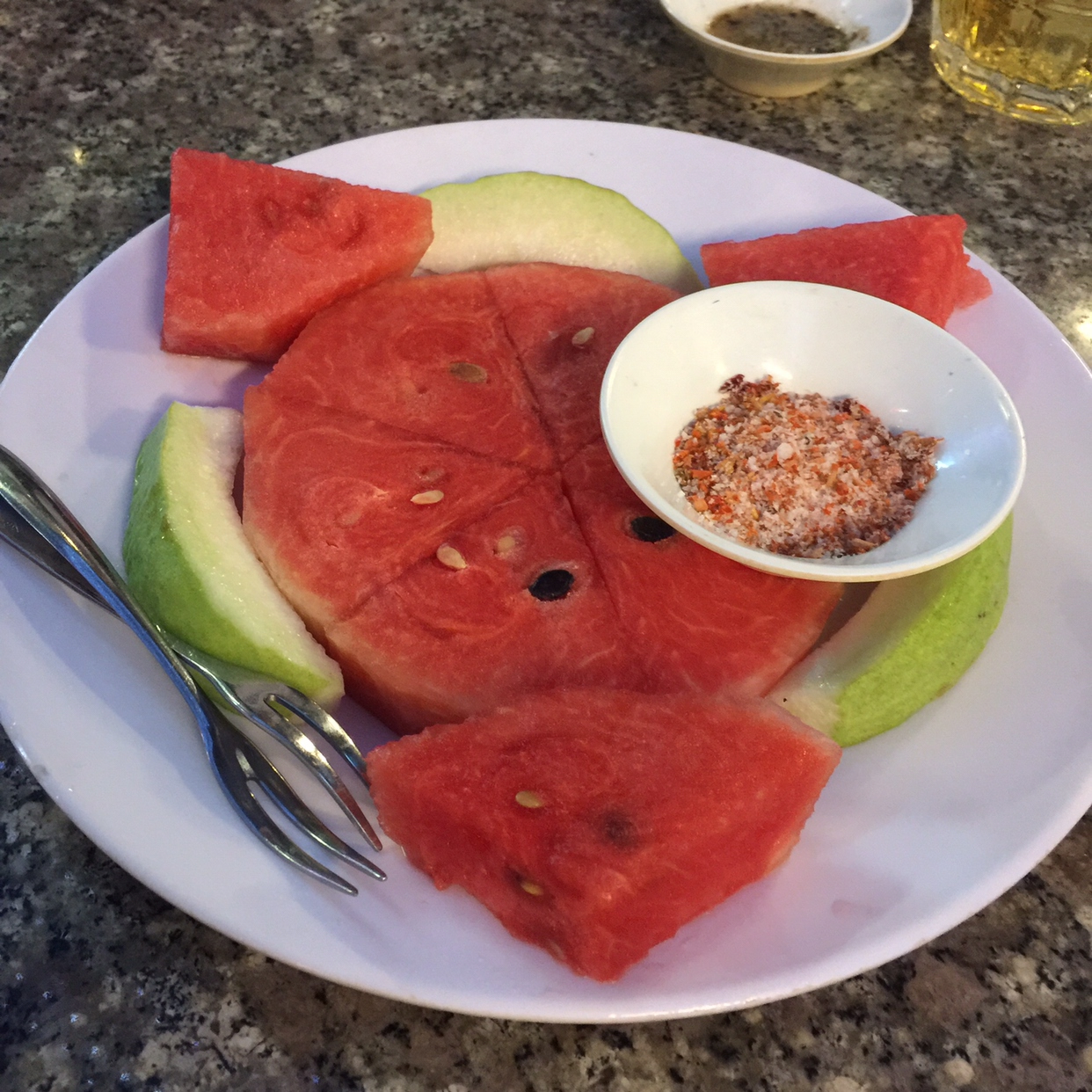 수박을 우리나라 순대 찍어먹는 소스와 비슷하게 페퍼와 소금 등이 섞인 양념이 함께 나와 좀 어리둥절했지만 나름의 이색적인 맛이 있었다.