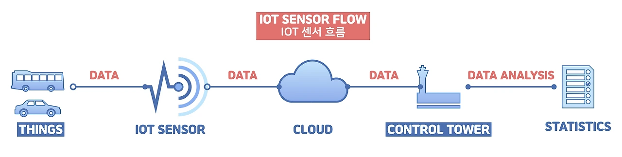 간단하게 IoT 센서의 흐름을 플로우 차트로 그려봤다. 사물이 IoT 센서를 지나가거나 사물에 센서를 부착하고 IoT 센서를 통해 모아진 데이터는 클라우드 저장공간을 통해 데이터 센터 또는 관제 센터에서 확인할 수 있다. 이때 관제 센터(또는 기업, 기관)에서 어떤 데이터로 어떻게 활용하는지는 해당 기업/기관에서 기획해 통계를 분석한다.