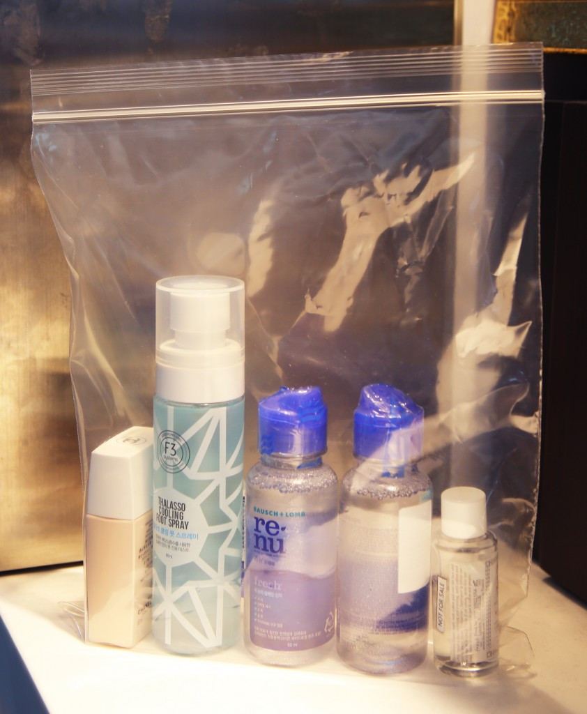 수하물을 부치지 않는 경우 액체나 젤은 100ml 이하 용기에 담아 비닐백에 넣으면 된다. 스프레이는 수하물로만 부칠 수 있으니 참고!
