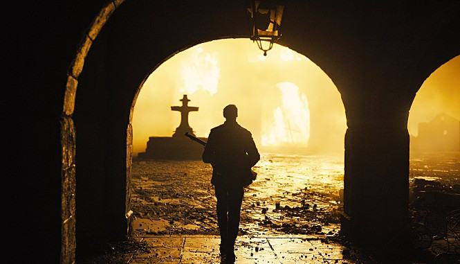 카메라는 죽은 저격수를 넘어 창문으로 쭉 내려가고, 음악은 서서히 고조되면서, 반쯤 무너진 마을로 스코필드가 천천히 들어가는 장면. 살아있는 적군을 찾아 끝까지 말살하려고 적기가 조명탄을 쏘며 날아다니고, 조명탄이 터지는 소리와 함께 한 번씩 낮처럼 밝아지는 광경, 적기의 움직임에 따라 건물 그림자가 유유히 자라나듯 펼쳐지는 광경은 너무나도 초현실적으로 보인다. 보이는 것과 음악이 어우러져 가슴을 쥐어잡게 하는, 놀라운 장면이다.