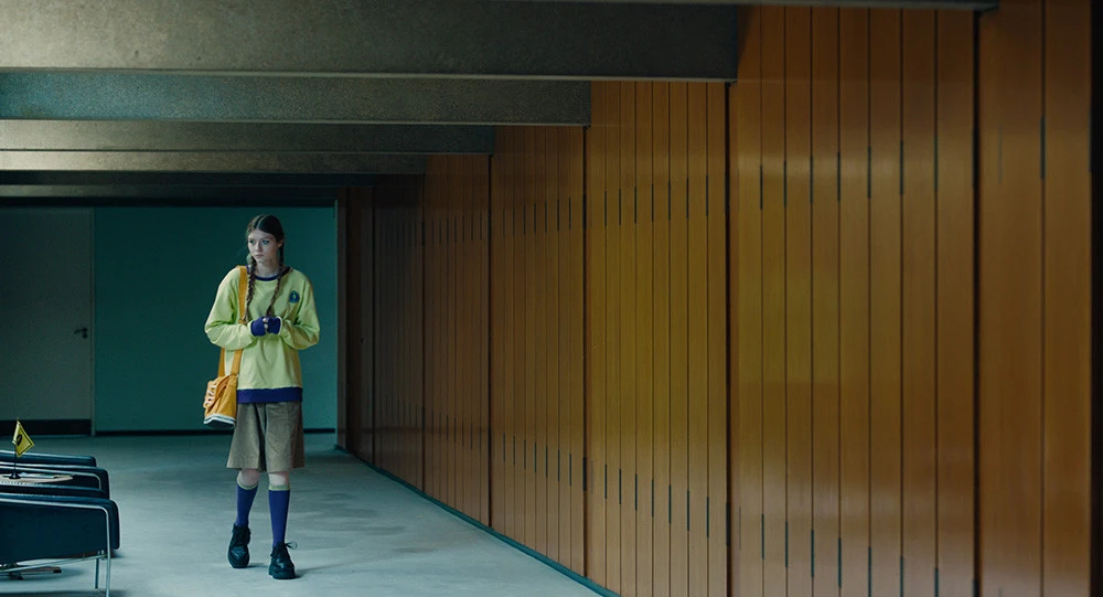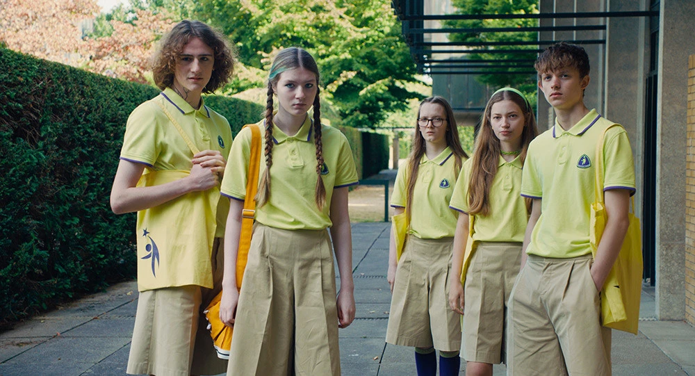 이 영화에서 기묘하게 삐딱한 느낌으로 고정된 샷을 많이 사용하는 카메라는, 아이들의 목소리를 담을 때만큼은 적극적으로 패닝(pan)해 움직인다. 가구의 직선이 강조된, 움직이지 않는 배경을 뒤로 하고, 학교 풍경은 기이하게 삭막하다. 노란색과 파란색 교복을 비롯한 원색들이 기묘하게 튀어 오르고, 강박적으로 울리는 음악이 끈덕지게 우리를 스크린으로 끌어 당긴다.