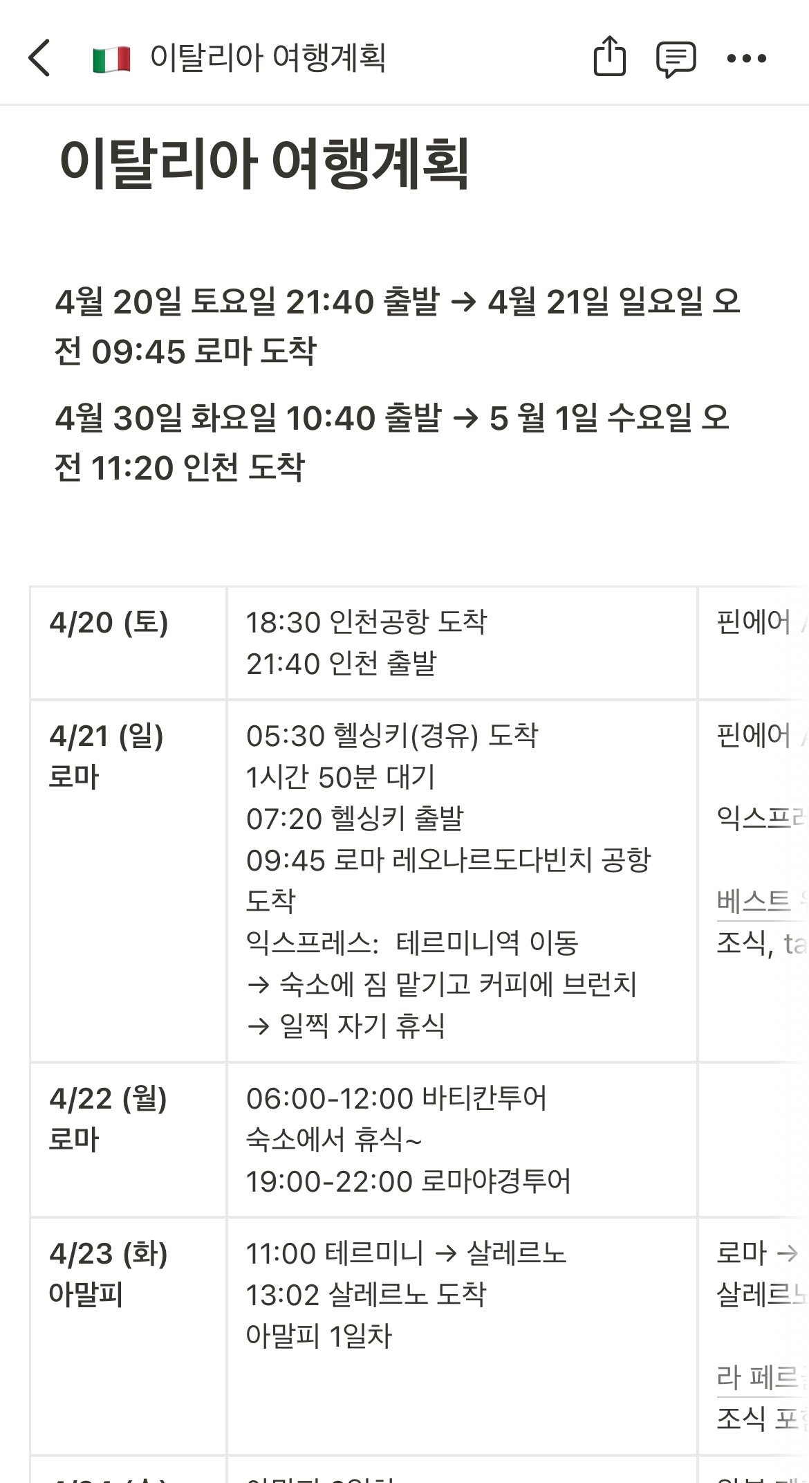 침착하게 우선 로마-스펠로 행부터 결제해 보려 했으나, 역시나 되지 않았다. 뭐야. 뜬 오류 메시지를 포함하여 초록창 검색을 또 동앗줄처럼 붙든다. 같은 현상을 마주하신 분의 진땀이 느껴지는 카페 질문 글과, 유럽여행 고수로 추정되는 회원님이 달아두신 댓글이 보인다. 그러면 한 2주쯤 있다가 다시 해보시면 될 거라고. 오... 한국에서라면 있을 수 없는 해법이지만 뭐 그렇군.. 실제로 몇 주 후에 해보니까 됐다. 그새 가격이 좀 오르긴 했지만... 역시 코레일이 최고다 생각하며 기차 예약을 무사히 마무리했다. 그리고 어쩐지 mbti 끝자리가 J가 된 듯한 뿌듯함을 느끼게 해주는 어플 노션에 페이지를 하나 만들었다.