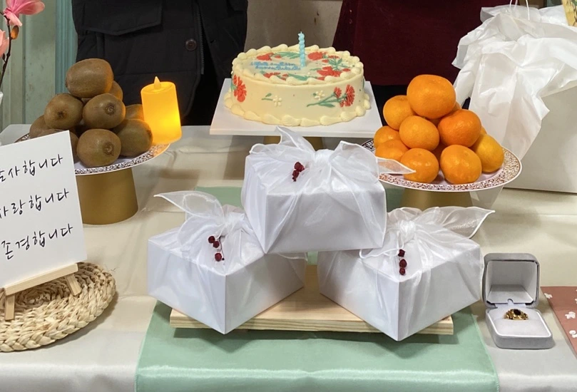 ‘잔치’ 느낌으로 많은 사람을 초대하지는 않겠지만 아빠 친구 분들은 좀 다녀가실 것이다. 나나 동생뿐 아니라 우리 아빠도 친구 분들께 생일 선물을 받는다. 어른스럽게, 많은 경우 돈 봉투를 건네시는 것 같았다. 생각지도 못한 동네 어른들이 마치 경조사 축의금처럼 건네 주시는 경우도 있었다. 아, 지역사회의 따끈따끈 끈덕한 관계망이란. 그렇다면 잔치의 핵심, 답례품을 준비해 보자. 너무 비싸지 않은 호두정과 정도를 염두에 두고 검색하다가… 보고 만 것이다. 곱디 고운 보자기 포장을. 그걸 보고 나니 일반 플라스틱 통이나 종이 상자에 담긴 건 눈에 들어오지도 않더라. 값이 배로 비쌌지만 어차피 개수가 그렇게 많지 않으니, 기왕 답례품으로 드리는 거라면 받을 때 기분 좋은 것으로 하자며 보자기에 곱게 싸인 호두 정과를 주문했다.