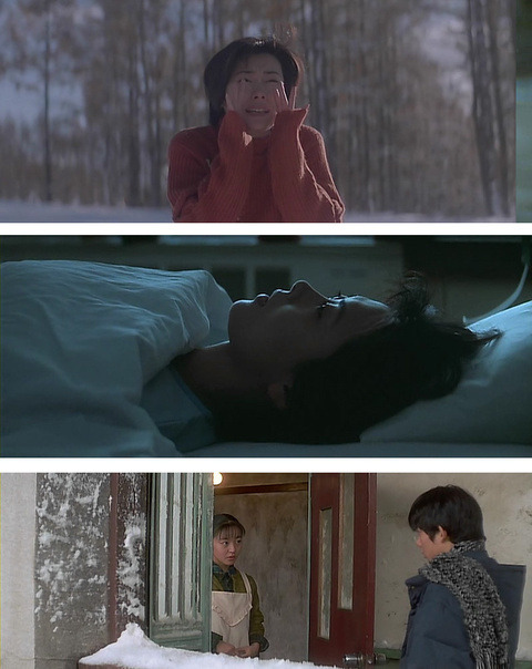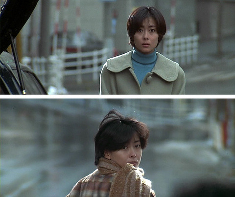 영화는 히로코(나카야마 미호)가 눈밭에 드러누워 숨을 끝까지 참았다가 몰아쉬는 장면에서 시작한다. 처음에는 별 생각 없이 속눈썹이 예쁘다는 생각을 하다가, 몇 번 돌려 보고 나니 이 장면은 참 가슴 아프게 와 닿았다. 설산에서 조난 당해 죽어간 옛 연인의 기분을 그렇게라도, 간접적으로라도 느껴보고 싶었던 건 아닐까. 오프닝의 히로코는 2년 전 죽은 연인 이츠키의 추도식에 가는 길이었다. 영락없이 술로 이어지는 어수선한 추도식 분위기가 싫었던 이츠키의 어머니가 두통을 호소하는 바람에, 이츠키의 어머니를 태우고 그 집까지 운전해 가게 된다.