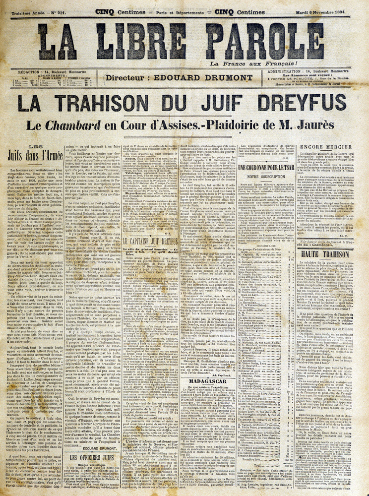 무어라 손을 써 볼 틈도 없이 드레퓌스는 체포되었고, 언론은 기다렸다는 듯 이를 대서특필했다. 1894년 11월 6일 자 <라 리브르 빠홀> 지 헤드라인은 "유대인 드레퓌스의 내통"이었다. '유대인'이라는 단어를 헤드라인에 굳이 끼워 넣었다는 점에서 강력하게 느껴지는 그 의도를 우리는 '반유대주의'라고 부른다.