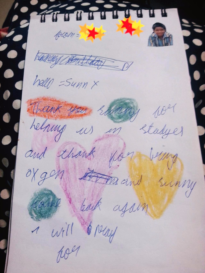 그날 밤이었는지 다음 날 밤이었는지는 기억나지 않는다. 아이가 내 이름을 부르며 종이 한 장을 달라고 했다. 학용품을 관리하는 사람은 내가 아닌데... 얼굴에 물음표를 띄우고 아이를 보자, 아이는 헙 하고 입을 다물더니 후다다 달려갔다. 뭐지? 나중에 알고 보니 써니 디디에게 편지를 쓰기 위해 종이를 달라고 한다는 게, 급한 마음에 써니 디디 이름부터 나온 거였다. 어떻게 알았냐면, 아이가 주춤거리며 다가와서는 곱게 접은 편지 한 장을 건네주었으니까.