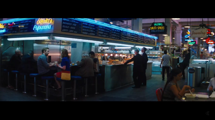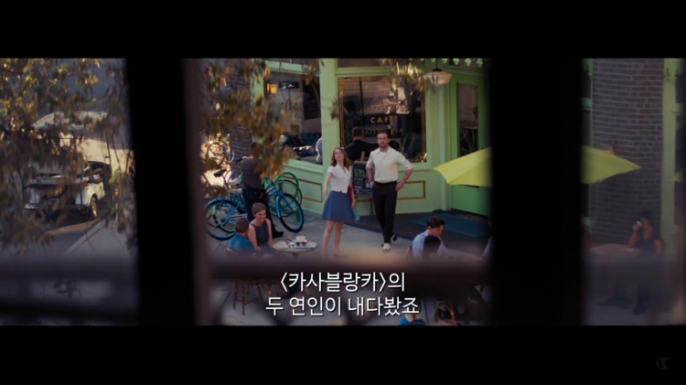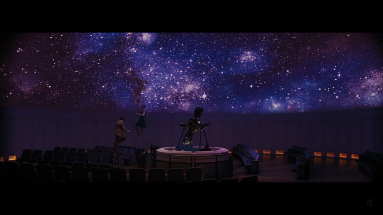 무엇보다도 라라랜드라는 영화 속에 별도의 무대나 세트가 있는 것처럼 느껴지는 장면들이 내겐 무척 인상적이었다. 내 생각엔 주인공 두 사람이 한껏 꿈 꾸고 있을 때나 그 꿈으로 서로를 사랑할 때 두 사람을 둘러싼 배경이 꼭 영화 세트장 같았다는 느낌이다. 두 사람이 모처럼 만난 저녁 식탁에서 갈등을 빚을 때, 세바스찬이 밴드 사진 촬영을 하던 때, 미아의 고향 집에 찾아가서 둘이 이야기할 때, 낮에 천문대를 찾아갔을 때는 영화 속의 무대를 보는 느낌이 아닌, 그냥 보통 영화 앵글로 보는 느낌이었다.