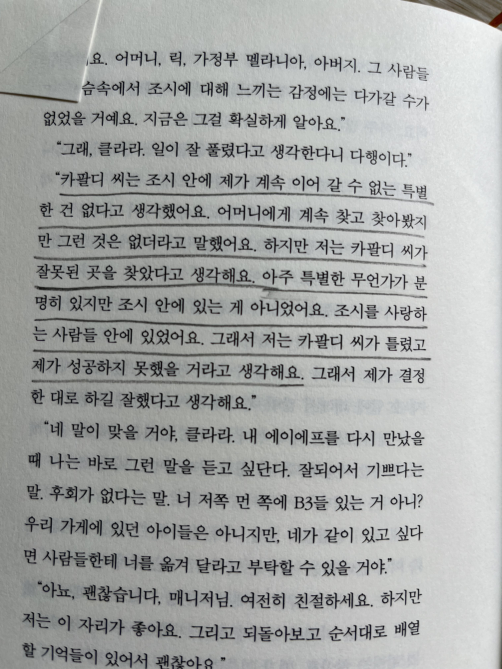 이후에 클라라는 아픈 조시를 위해 최선의 노력을 다한다. 그리고 자신의 몸을 이루는 중요한 부품까지 내놓으면서 조시를 구하려고 고군분투한다. 인공지능 로봇의 희생이라니! 결국 조시는 건강하게 성인이 되고 대학에 진학하기 위해 집을 떠나게 된다. 조시가 떠난 집에 남게 된 클라라는 예전에 자기가 진열되어 있었던 매장에서 일하던 매니저를 만나게 된다. 아주 오랜 시간이 흐른 후에 만난 두 사람은 그간의 삶에 대해 이야기를 나눈다. 그때 클라라가 자신은 조시를 배우기 위해 최선을 다했을 테지만 잘 되지는 않았을 거라고 말한다. 아무리 노력해도 조시의 어머니나 친구 릭, 가정부 멜라니아, 조시의 아버지가 조시에 대해 느끼는 감정에는 다가갈 수 없었을 거라고. 그러면서 ‘인간의 아주 특별한 무언가는 인간의 내부에 있는 것이 아니라 그를 사랑하는 사람들 안에 있는 것’이라고 말하는데 나는 갑자기 눈물이 났다.
