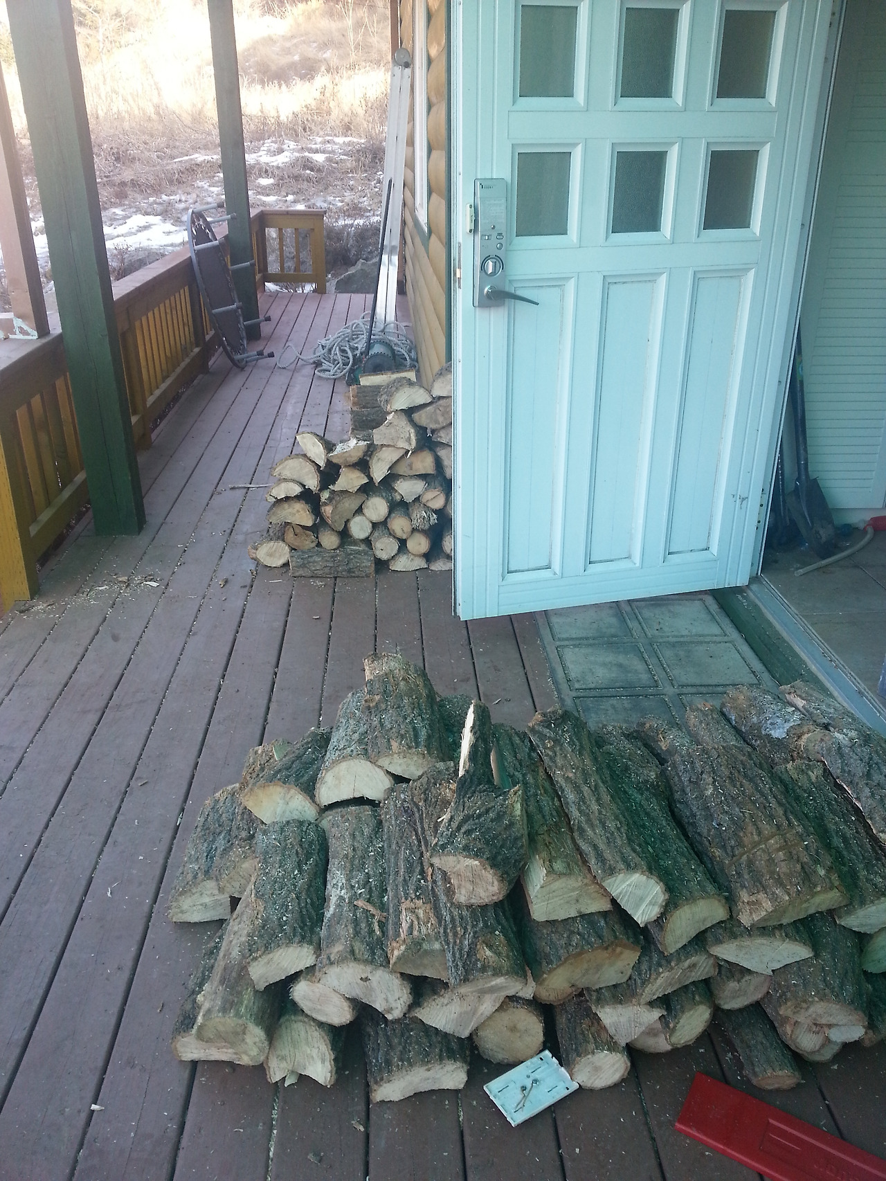 통나무를 전기톱, 엔진톱으로 자르고 그걸 다시 도끼로 쪼개는 일들은 40대였던 남편이 도맡아 했다. 역시나 40대였던 난 남편이 통나무를 자를 때 나무가 흔들리지 않게 잡아주는 역할과 남편이 도끼질을 하기 쉽도록 누워있는 절단목들을 미리 세워놓는 역할, 그리고 쪼개진 장작들을 현관 가까이에 쌓는 역할을 맡았다.