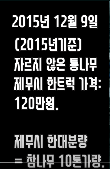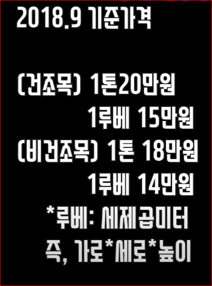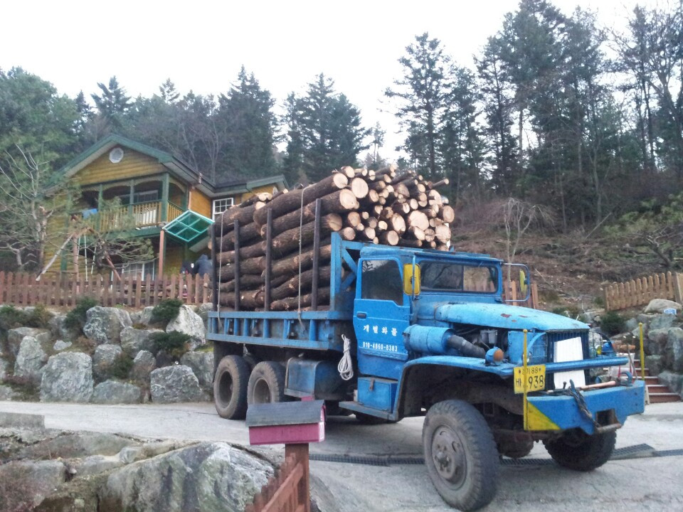 2015년 기준, 참나무 10톤에 해당하는 제무시 (GMC) 한 트럭분의 통나무 가격은 120만 원이었다. 저런 통나무를 일정 길이로 자르기만 해서 판매하는 절단목이나 그 절단목을 장작으로 쪼개서 파는 쪼갬목의 가격에 비하면 정말 저렴한 가격이었기에 40대였던 남편과 난 과감하게 통나무를 선택했더랬다.