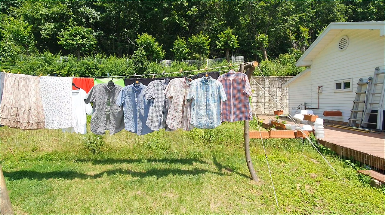 전원주택 마당 빨랫줄에 빨래를 말릴 수 있다는 것은 주부들이라면 모두 장점이라고 생각할 거다. 지금의 산속 전원주택으로 이사 오기 전엔 평지의 길가에 있는 전원주택에 살았었다.