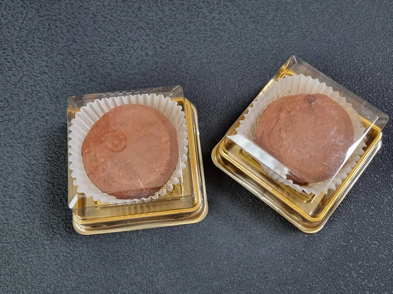 겉은 초코렛 가루가 덮여 있고 아래엔 모찌떡인가 싶은데 늘어나는 듯 쫀득한 것으로 덮혀있고, 안쪽은 바삭한 세 겹 식감이 한 입에 들어옵니다.