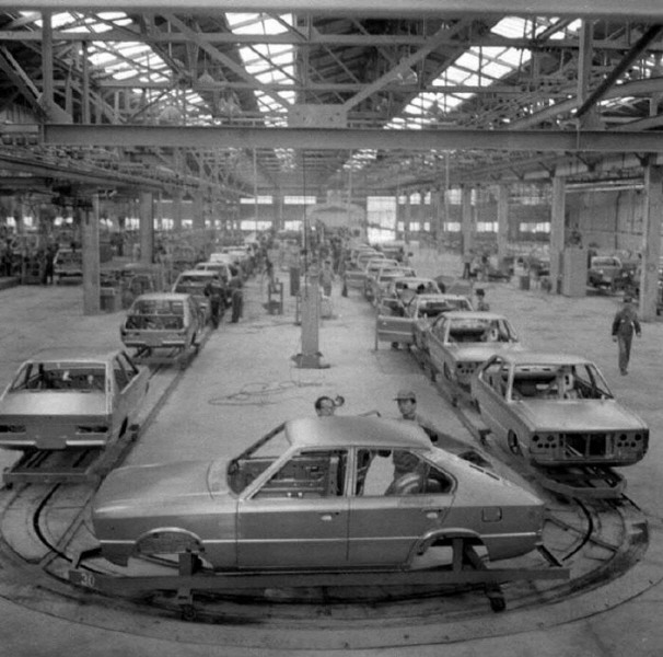 포니를 생산하고 있는 현대자동차 울산 공장 1976년 (출처: 국가기록원 - Public Domain)