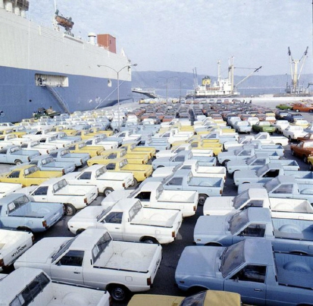 수출 선적을 위해 기다리고 있는 포니 픽업 모델 1978년 (출처: 국가기록원 - Public Domain)
