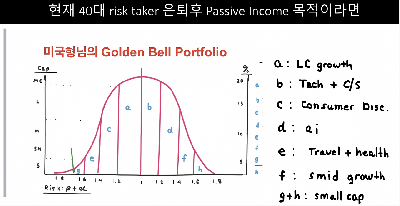 d는 인공지능(AI) 관련 중소형 주나 반도체 주식 등으로 구성한다. e는 여행이나 헬스 관련 주식들이다. f는 중형 성장주, 나머지는 스몰캡 주식들로 소량 구성하면 된다.