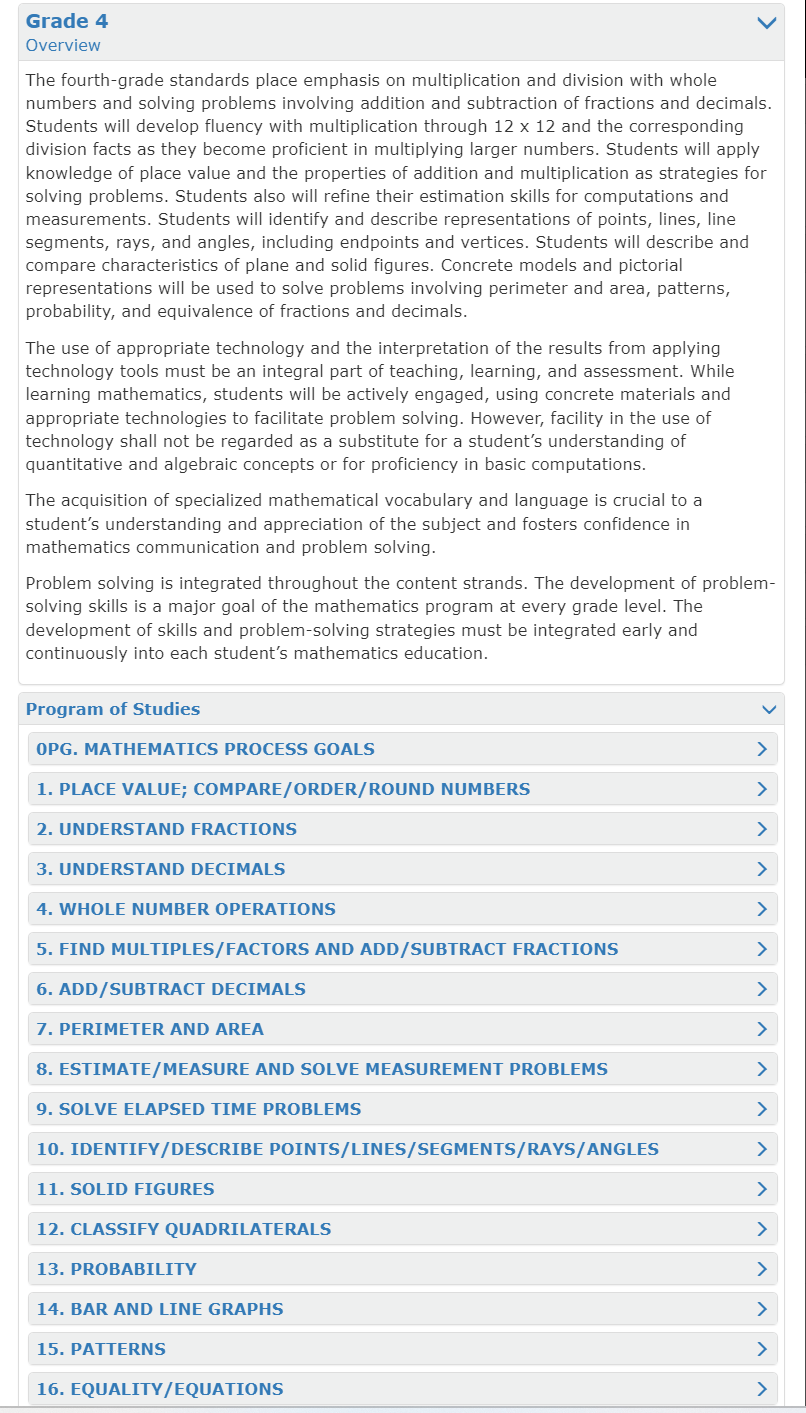 아래는 버지니아 한 카운티의 초등 4학년 수학 표준이다.