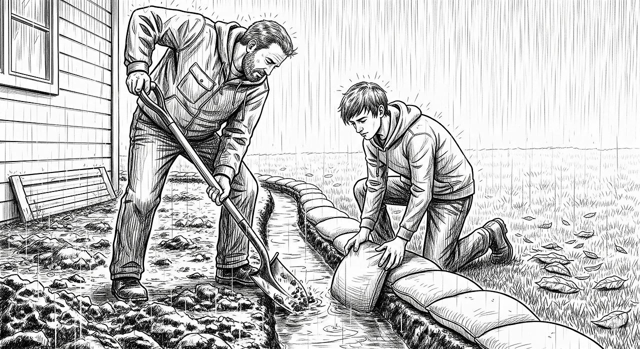 마당 한 켠에 고인 물이 서서히 집 쪽으로 밀려와, 한쪽 벽에 차오르고 있었다. 남편과 아들이 삽을 들고 나가 땅을 파 물길을 내고 모래주머니로 둑을 쌓자, 집을 향하던 물은 이내 방향을 틀어 맨홀로 빠져나갔다. 단 한 줄의 물길이 집을 지켜낸 것이다.