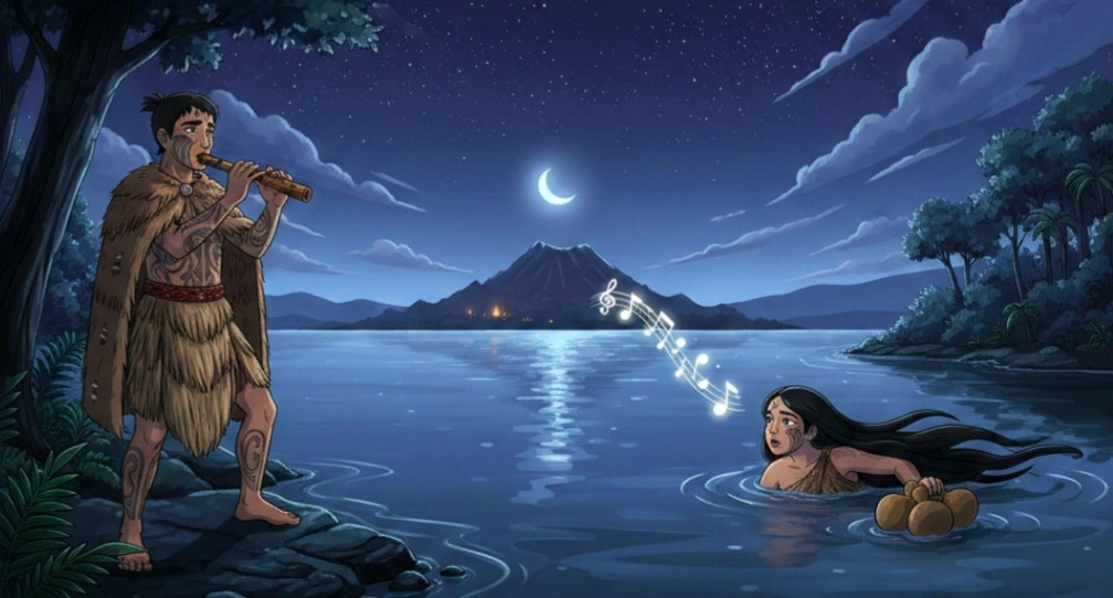 청년 투타네카이는 밤마다 호숫가에 나와 그녀가 있는 섬을 바라보며 피리를 불렀고, 히네모아는 이 애절한 피리 소리를 듣고 마침내 호수를 헤엄쳐 건너갈 용기를 내었다.
