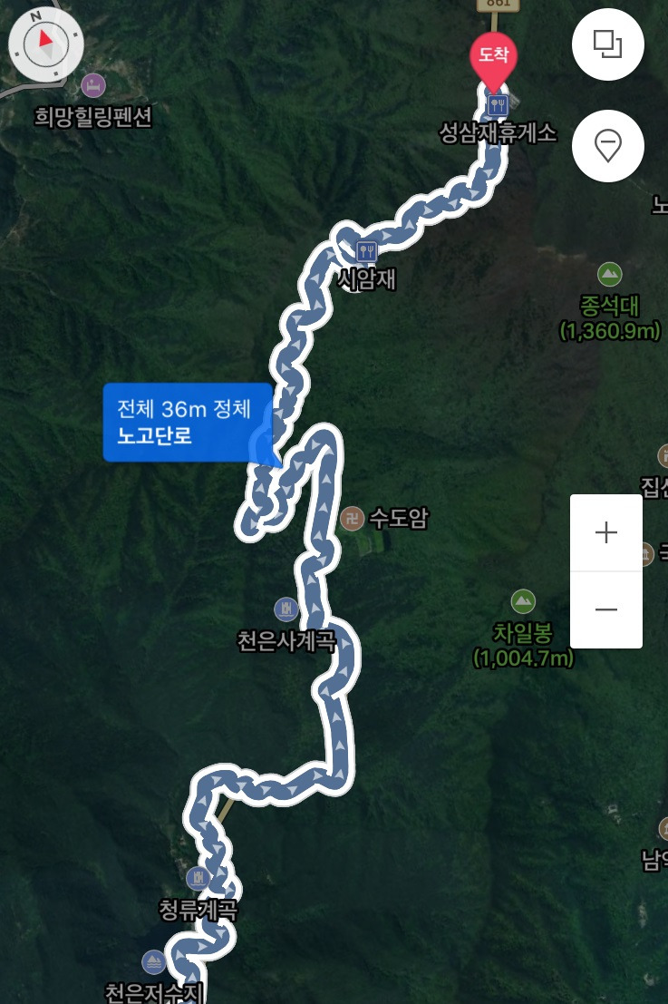 우려와는 달리 실전은 철저히 나의 계획대로 진행됐다. 일부러 느리게 가지 않아도 산길은 애당초 나 같은 초보가 속도를 낼 곳이 아니었기 때문이다. 하늘이 도왔는지 길에 차도 거의 없었다. 만에하나 이 아슬아슬한 2차선 도로 반대편에서 관광버스가 덮치듯 달려왔다면? 내 뒤로 길게 늘어선 관광버스와 행락객들이 빨리 좀 가라며 일제히 경적을 울렸다면? 아… 정말 상상도 하기 싫다. 신께서 이 치기어린 초보를 진정 가엾게 여기신 게 틀림없었다.