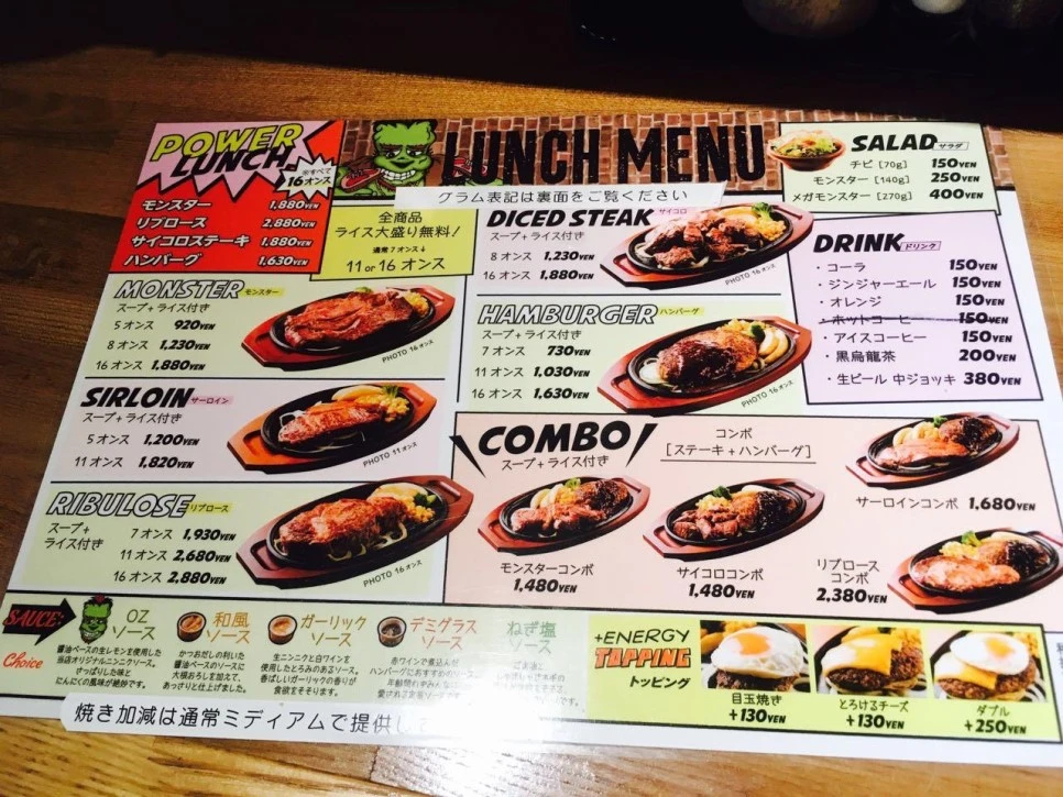 '스테이크&함바그 몬스타그릴', 이 집 앞을 지나가는데 솔솔 풍기는 고기 익는 냄새에 우리는 완전히 압도당했습니다. 그 냄새를 맡는 순간, 우리는 더 이상 앞으로 나아가지 못하고 바로 방향을 돌려 이 집으로 입장하였습니다.