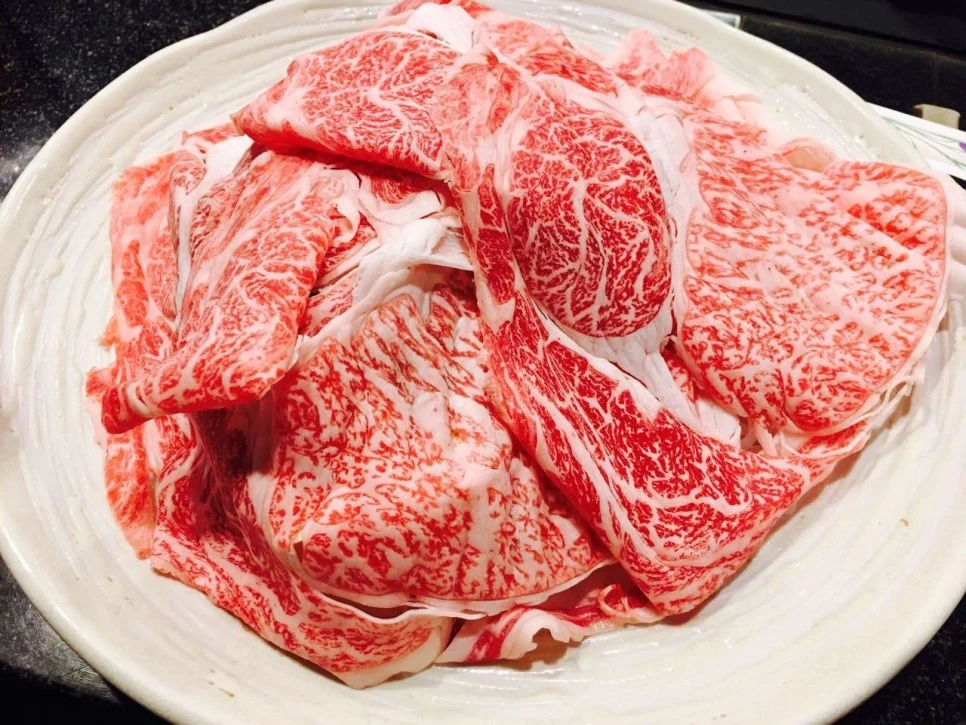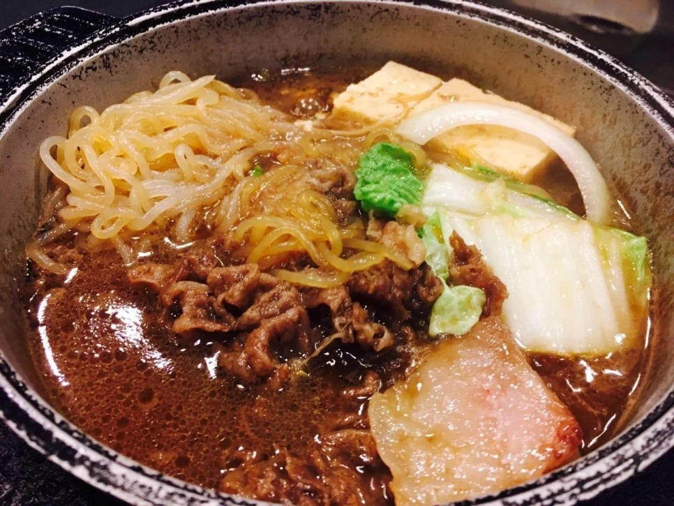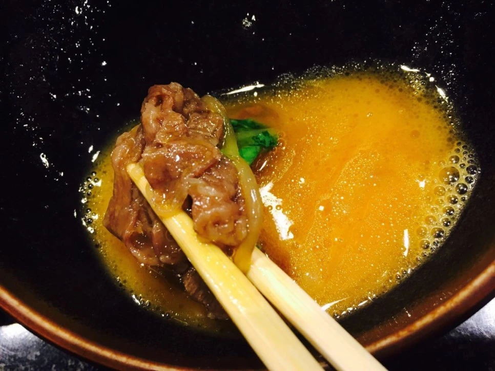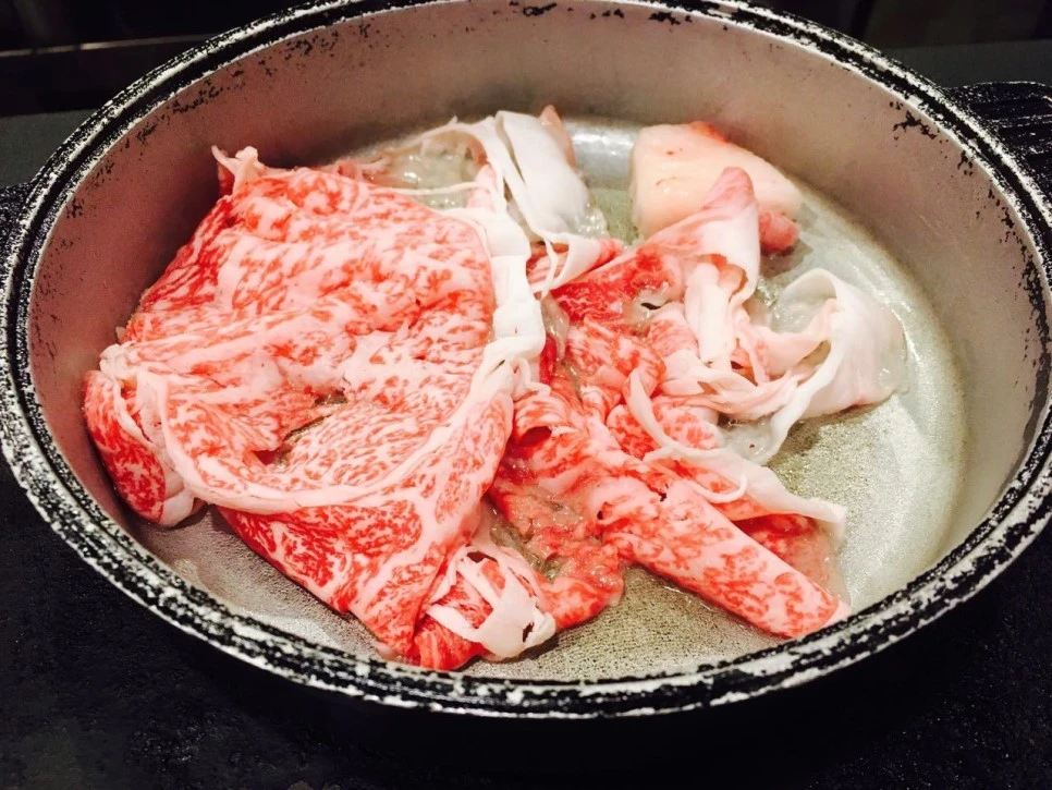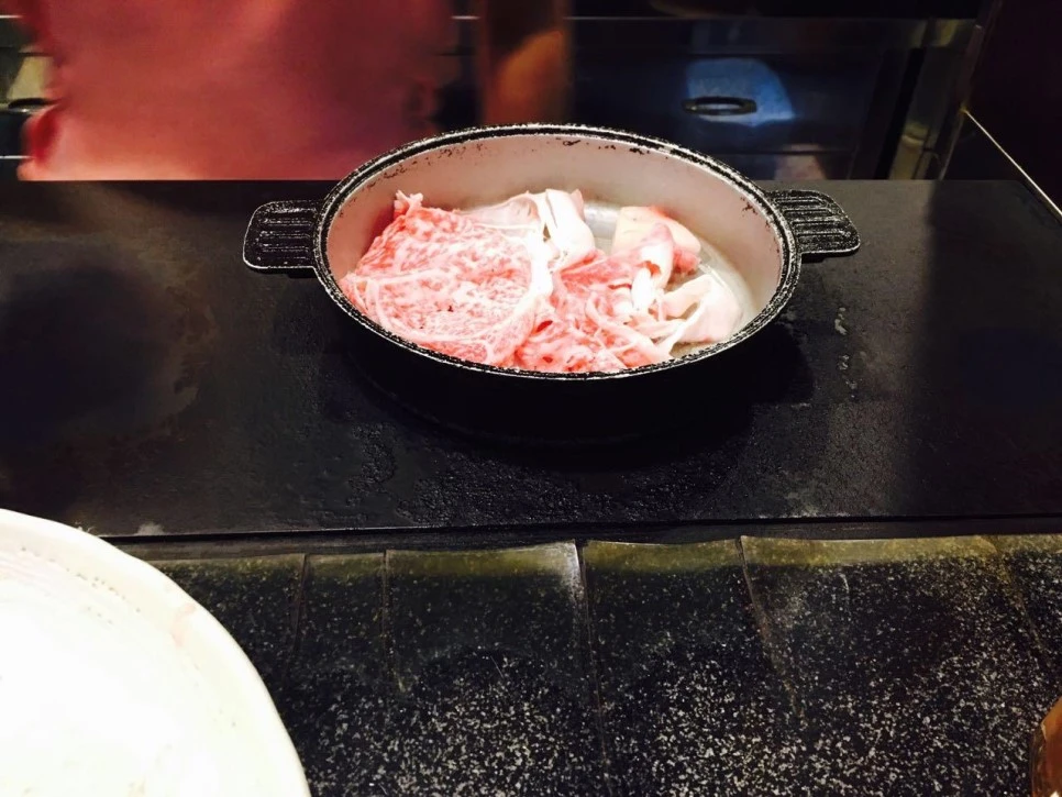 전골냄비에 고기를 먼저 넣고, 양념국물을 적당히 넣은 후 야채 등을 넣고 재료를 익혔습니다. 그리고 고기를 한 점 집어서 입으로 가져갔지요. 고기는 입안에 들어감과 동시에 녹듯이 없어졌습니다. 예상은 했지만 정말 황홀한 맛이었어요.