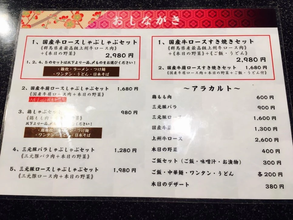 메뉴판을 보고 먼저 제일 비싼 메뉴인 2980엔짜리 '국산 소고기 등심 스키야키 세트'를 각각 1인분씩 주문하였습니다. 이 세트에는 군마현산 최고급 조슈우규 등심과 오늘의 야채 그리고 밥과 우동사리를 포함하고 있었습니다.