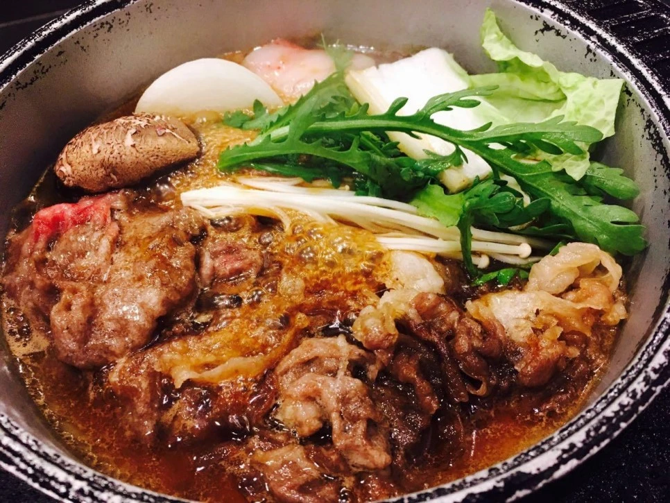 고기는 양이 많지는 않았으나 빛깔에서부터 신선함이 묻어났습니다. 보는 순간, '이건 맛있겠다!'란 확신이 밀려왔지요. 스키야키는 간장, 설탕, 미림 등으로 만든 양념국물에 얇게 썬 쇠고기와 각종 야채, 두부, 실 곤약 등의 재료를 넣고 자작하게 졸여서 먹는 일본의 대표적인 전골요리입니다. 그만큼 무엇보다도 재료의 신선함이 중요한 요리가 스키야키인지라 그 맛이 기대가 되었습니다.