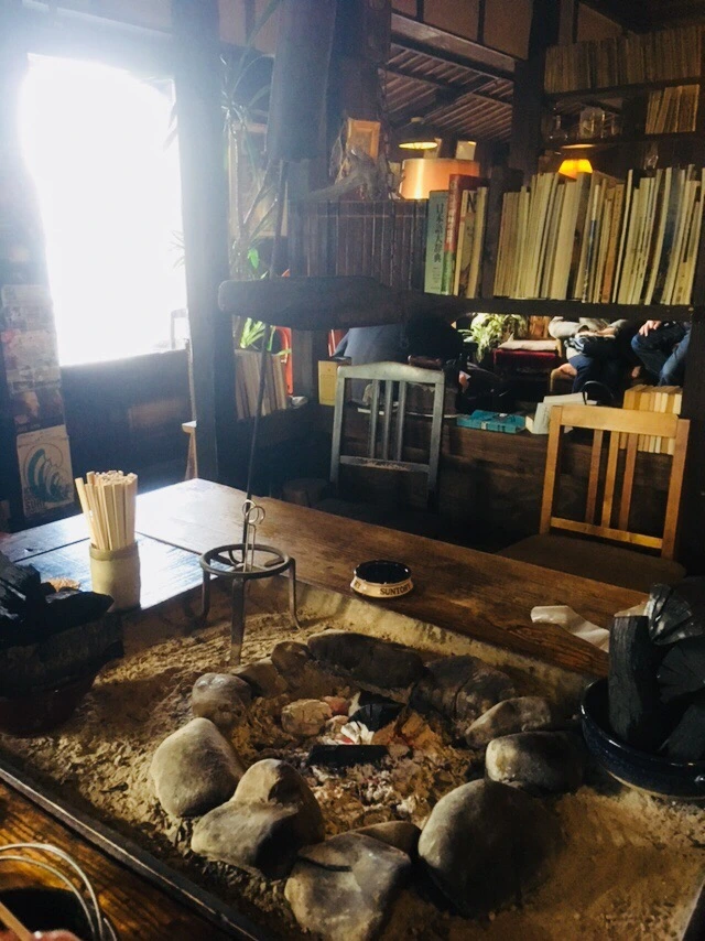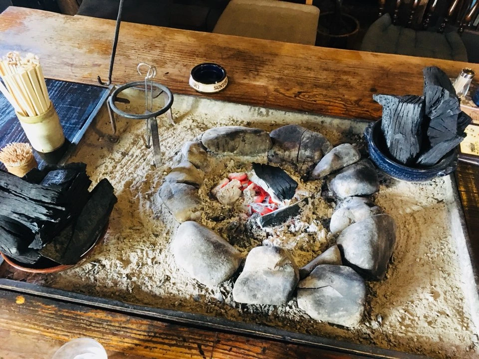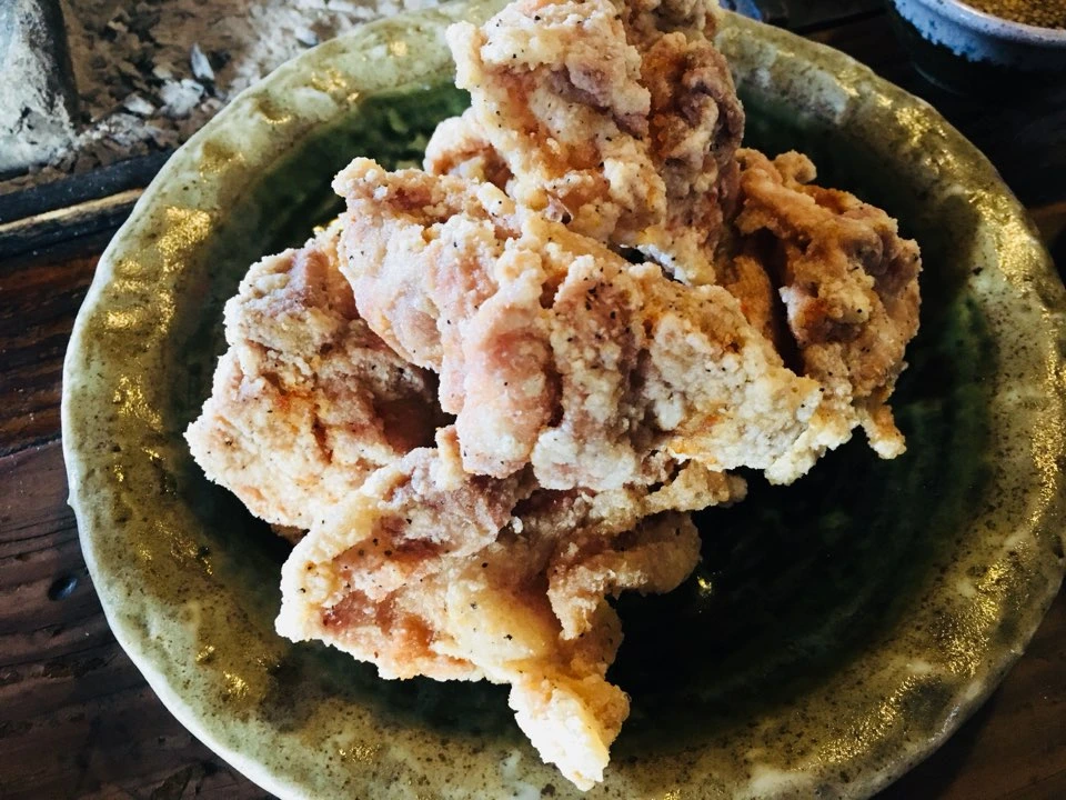 우리는 이로리(숯 화로)가 있는 탁자에 앉아 오로천 라멘(곱창라면)과 가라아게(닭튀김)를 먹었습니다. 훈훈한 온기가 올라오는 이로리 옆에서의 식사는 따뜻한 온기와 함께 음식의 맛도 배가되는 효과가 있었습니다.