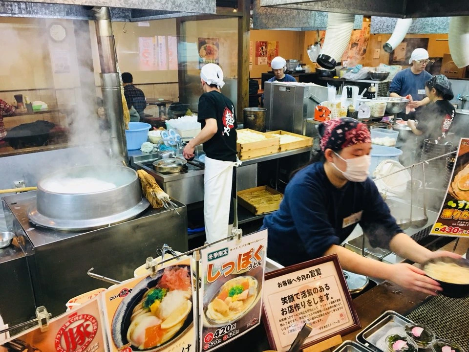 이 집은 아침부터 사람들로 북적였습니다. 우리 가족처럼 아침식사를 하기 위한 행렬이 길게 늘어서 있었습니다. 식당의 한 편에서는 우동면을 뽑기 위한 작업(?)이 진행되는 듯했고, 주방의 직원들은 분주하게 움직였습니다. 바쁘게 돌아가는 식당 안의 풍경은 식욕을 더욱 자극하며, 활기찬 하루를 다짐하게 만들었습니다.