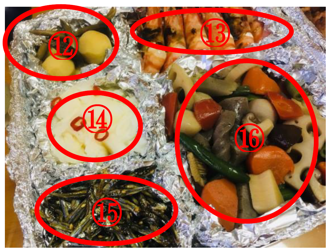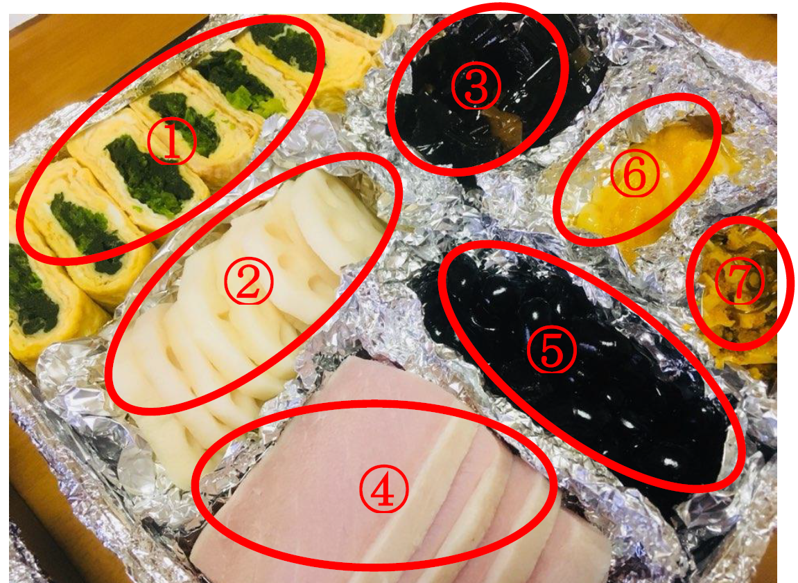또한, 검은콩 간장조림은 사악한 기운을 쫓아내고 오래 살 수 있도록 기원하는 음식인데 여기에 사용된 검은콩은 가가와현 소두섬 (小豆島/쇼도시마) 지역의 특산물을 사용합니다. 청어알 (数の子/카즈노코)은 자손의 번영을 비는 뜻에서 설날에 일본 국민들이 많이 먹는 음식이며, 연근은 구멍이 많이 뚫려 있는 식재료로써 미래를 내다볼 수 있는 통찰력을 가질 수 있도록 기원하는 의미를 담고 있습니다.